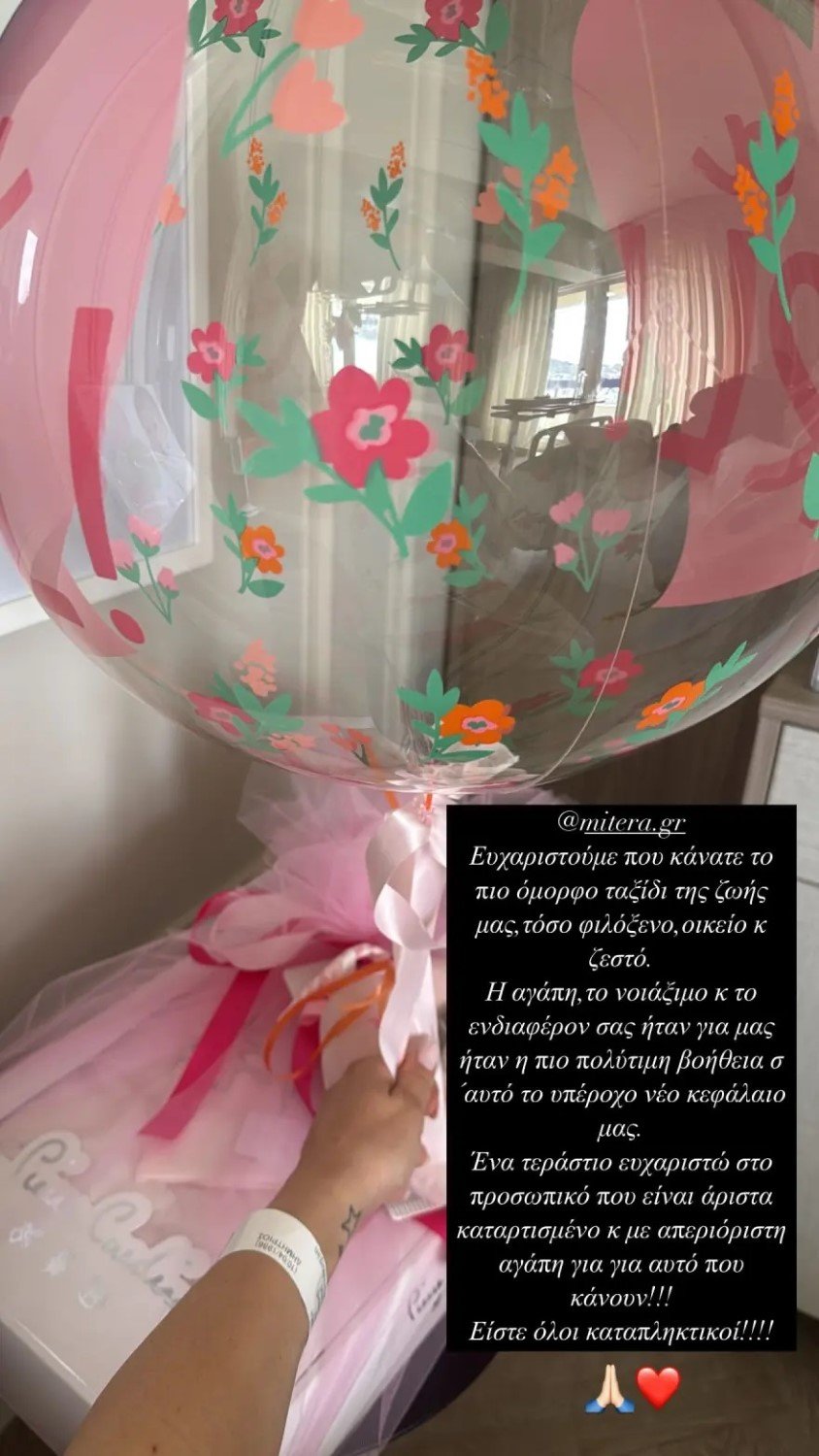 Ειδικότερα, ανέβασε μία φωτογραφία μ' ένα από τα μπαλόνια, που δέχτηκε ως δώρο για τη γέννηση του παιδιού της και με τη συγκεκριμένη εικόνα θέλησε να ευχαριστήσει το προσωπικό του μαιευτηρίου, για τη στήριξη και την καθοδήγησή τους, σε μία από τις από πιο ιδιαίτερες στιγμές για εκείνη και την οικογένειά της.