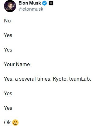 Ήταν επίσης περίεργη να μάθει ποιο είναι το αγαπημένο του anime, για τα ταξίδια του στην Ιαπωνία, αν γνώριζε την εικονική ποπ σταρ Hatsune Miku και αν η εικονική σύντροφος «Ani» της Grok AI ήταν εμπνευσμένη από τον φανταστικό χαρακτήρα «Misa» της σειράς manga «Death Note».