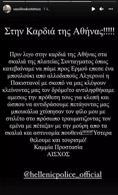 «Στην καρδιά της Αθήνας!! Πριν λίγο στα σκαλιά της πλατείας Συντάγματος όπως κατεβαίνουμε να πάμε προς Ερμού, έπεσε ένα μπουλούκι από αλλοδαπούς Αλγερινοί η Πακιστανοί με σκοπό να μας κλέψουν κλείνοντας μας τον δρόμο! Το αντιληφθήκαμε αμέσως της πρόθεση τους για κλοπή και ώσπου να αντιδράσουμε πετάγοντάς μας μπουκάλια, χτύπησαν τον φίλο μου με στιλέτο στο πρόσωπο τραυματίζοντας τον, εμένα με πέταξαν με την μούρη από τα σκαλιά και αστυνομία πουθενά!!!! Ύστερα θέλουμε και τουρισμό! Καμία προστασία, Αίσχος», περιέγραψε φανερά ενοχλημένος ο Βασίλειος Κωστέτσος.