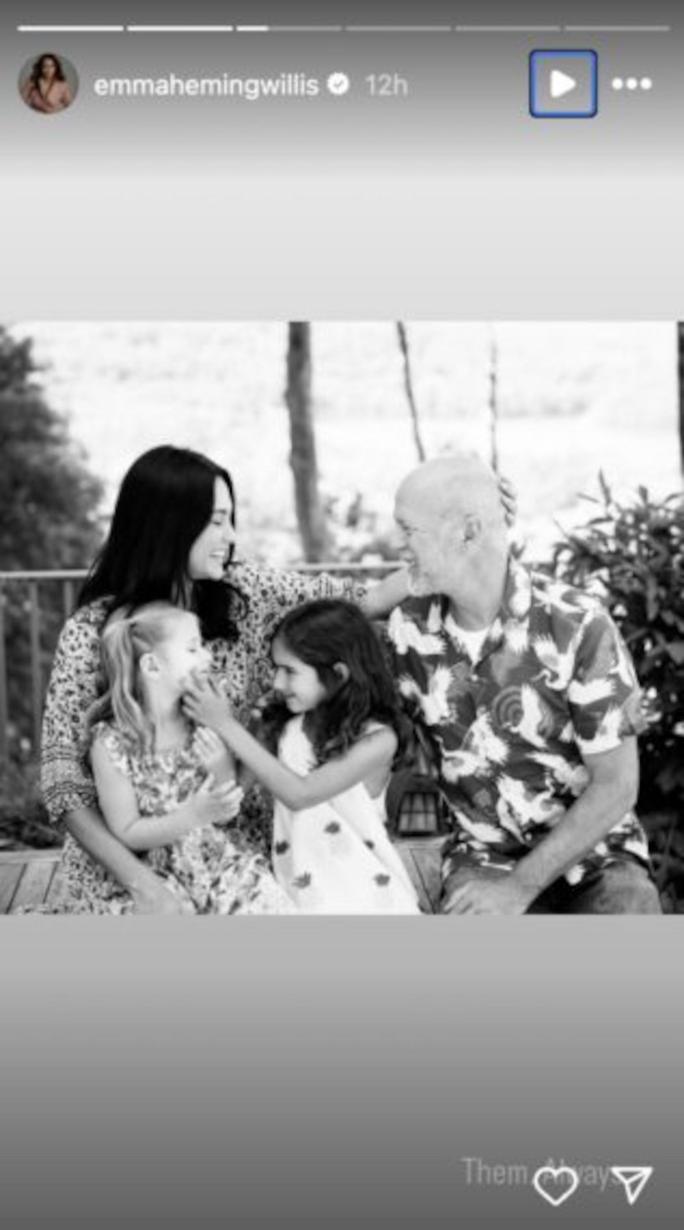 Μοιράστηκε επίσης φωτογραφίες του 69χρονου Μπρους να βοηθά ένα από τα παιδιά του να παίξει γκολφ και να χαμογελά σε μια βόλτα με φλιτζάνια τσαγιού, που φαινόταν να είναι throwback φωτογραφίες.