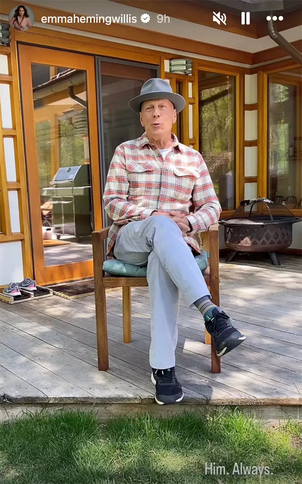 Ο Μπρους, ο οποίος πάσχει από μετωποκροταφική άνοια, εμφανίστηκε επίσης σε μια γλυκιά και σπάνια στιγμή στη ζωή του με την Έμα, καθισμένος σε μια καρέκλα σε εξωτερικό χώρο.