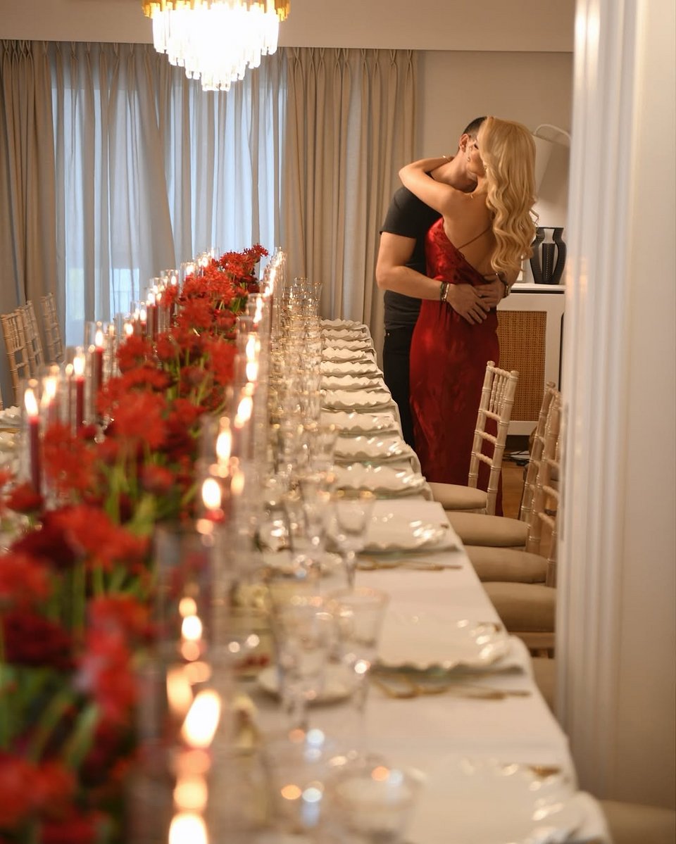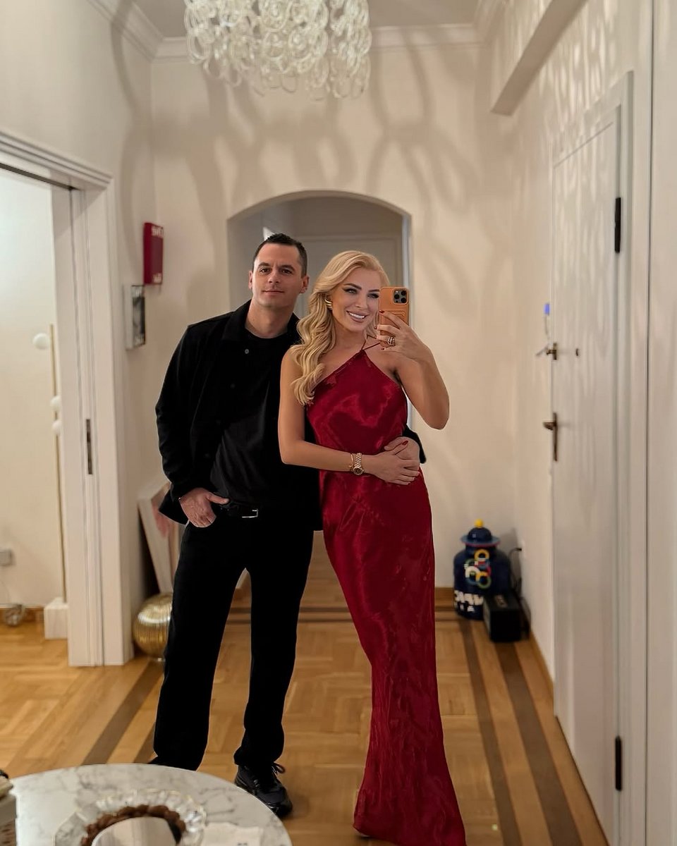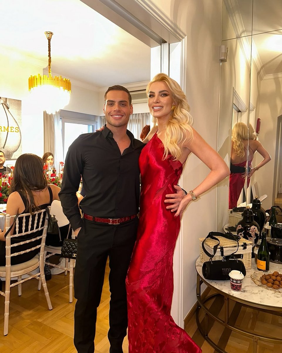 Η Κατερίνα Καινούργιου ήταν πιο ευτυχισμένη από ποτέ στην αγκαλιά του αγαπημένου της, Παναγιώτη, ενώ φορούσε ένα κόκκινο φόρεμα για την γιορτινή περίσταση.
