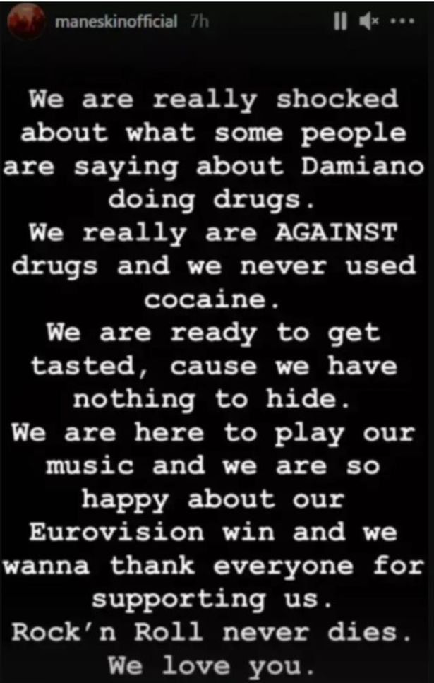 Σχετικό post έκανε και η μπάντα. «Είμαστε πραγματικά σοκαρισμένοι με όσα ακούγονται για τον Damiano και τη χρήση ναρκωτικών. Είμαστε κατά αυτών και δεν κάνουμε κοκαΐνη. Είμαστε έτοιμοι να κάνουμε τεστ γιατί δεν έχουμε κάτι να κρύψουμε. Είμαστε εδώ για να παίζουμε τη μουστική μας, χαιρόμαστε με τη νίκη μας στη Eurovision και ευχαριστούμε που μας στηρίξατε. Σας αγαπάμε», αναφέρουν στο Instagram story τους.