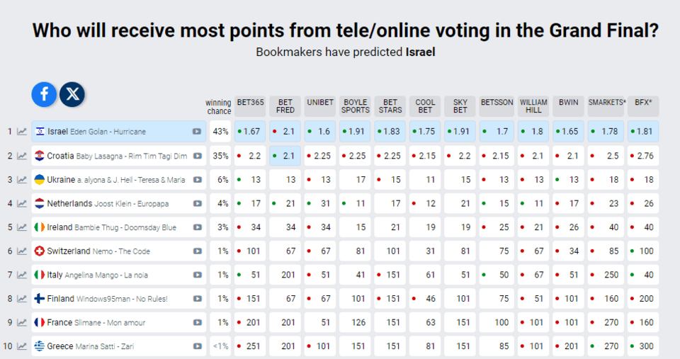 Το κλίμα... γύρισε υπέρ του Ισραήλ στην εφετινή Eurovision 2024 καθώς σύμφωνα με τα προγνωστικά το τραγούδι πέρασε στην πρώτη θέση.
