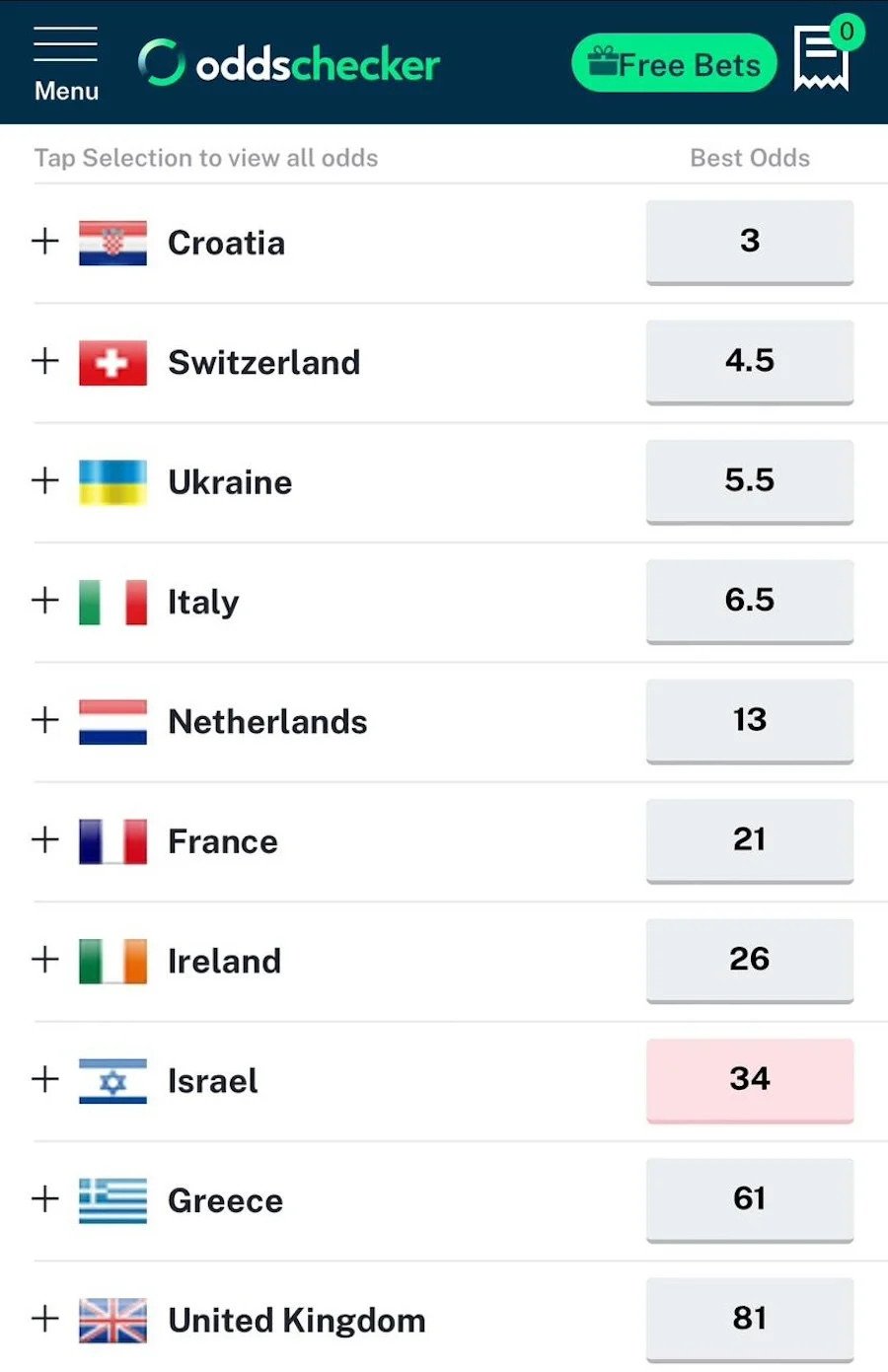 Στην κορυφή των στοιχημάτων στις πιθανότητες νίκης βρίσκεται η Κροατία με απόδοση 3. Ωστόσο, δεν μπορούμε να πούμε με ασφάλεια ότι φέτος υπάρχει απόλυτο φαβορί στον διαγωνισμό τραγουδιού.