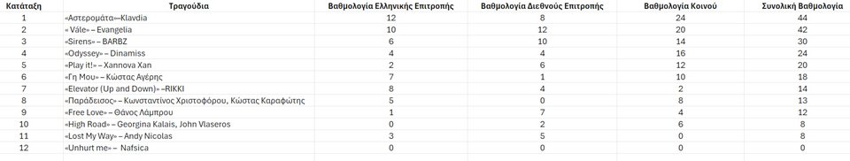 Η αναλυτική βαθμολογία των 12 τραγουδιών του Εθνικού Τελικού είναι η εξής: