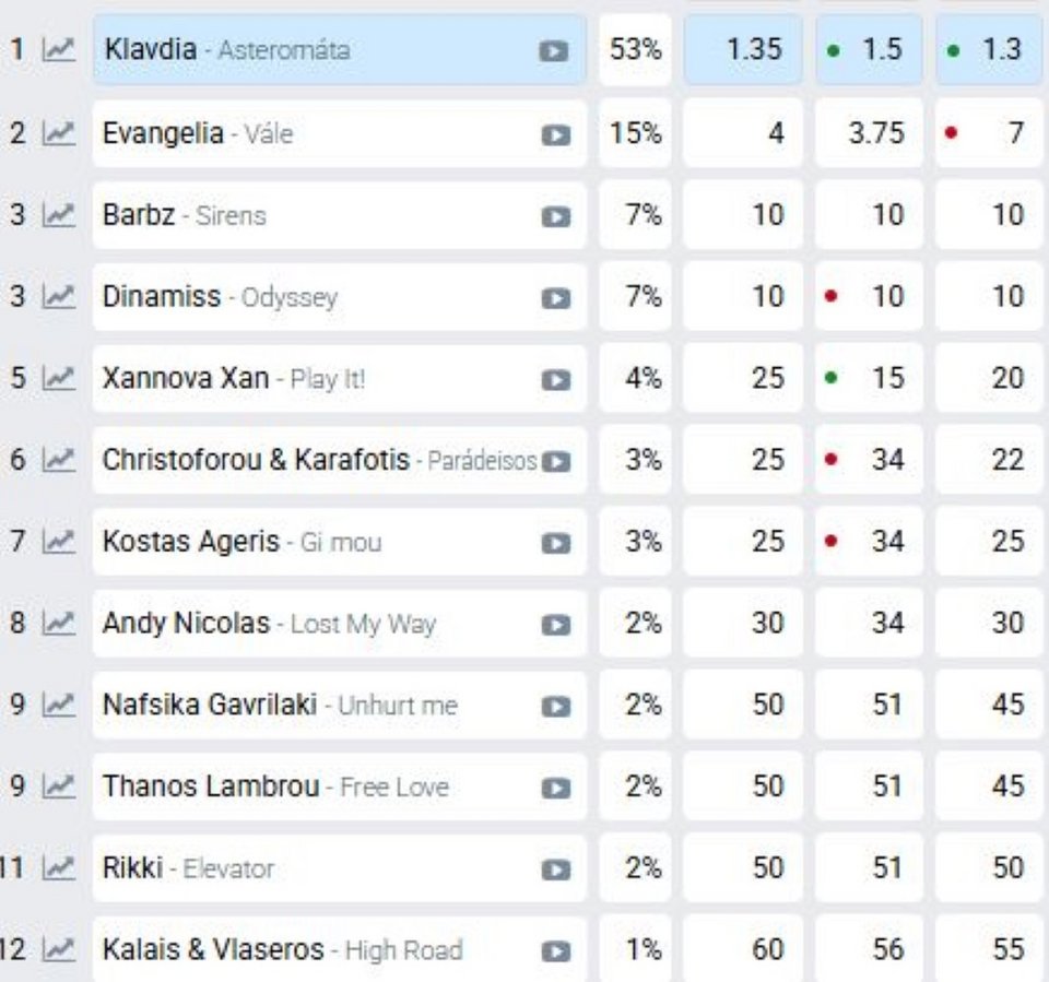 Όσον αφορά τις υπόλοιπες θέσεις, δεν υπάρχουν διαφοροποιήσεις ως προς την κατάταξη, με τις Dinamiss και BARBZ να έχουν ανέβει στο 10,00 και τα άλλα τραγούδια να παραμένουν σε αποδόσεις μεταξύ 20,00 και 55,00.