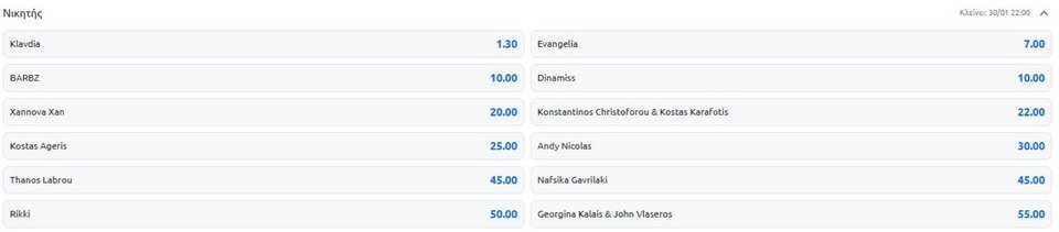 Ειδικότερα, η Κλαυδία είναι στο 1,35 (από 1,65), η Ευαγγελία ανέβηκε στο 6,00 (από 2,40), οι Dinamiss είναι σταθερά τρίτες με 10,00 (από 6,50), ενώ η BARBZ (Βαρβάρα Αργυρού) είναι τέταρτη ανεβαίνοντας στο 11,00 (από 9,00).