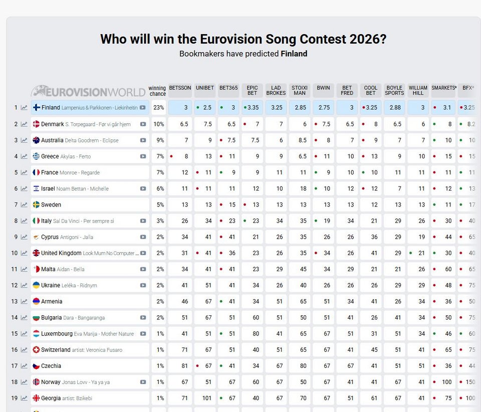 Στην πρώτη θέση εξακολουθεί να παραμένει η Φινλανδία, η οποία θεωρείται το απόλυτο φαβορί με ποσοστό 23%. Στη δεύτερη θέση βρίσκεται η Δανία ενώ στην Τρίτη η Αυστραλία. Ο Akylas με το «Ferto» παραμένει στην τέταρτη θέση και ακολουθούν η Γαλλία στην 5η και το Ισραήλ στην 6η θέση.