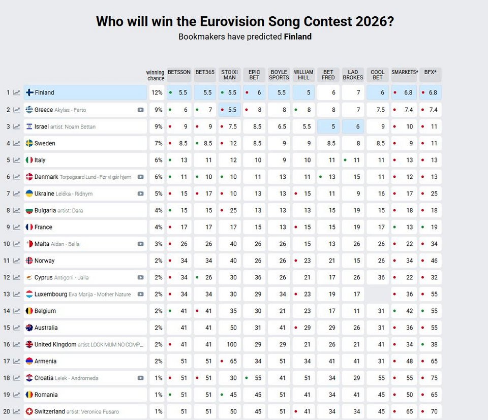 Όπως μπορεί να δει κανείς στον πίνακα με το σύνολο των στοιχηματικών εταιρειών, η Ελλάδα έχει περάσει το Ισραήλ, το οποίο βρίσκεται στην Τρίτη θέση παρόλο που δεν έχει ανακοινώσει ακόμη το τραγούδι του. Στην πρώτη θέση βρίσκεται η Φινλανδία η οποία επίσης δεν έχει ακόμη επιλέξει το τραγούδι που θα την εκπροσωπήσει.