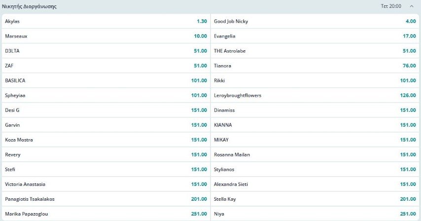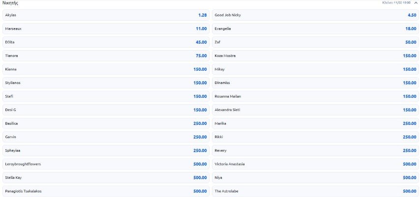 Ειδικότερα, ο Akylas εμφανίζεται ως το απόλυτο φαβορί, με τις δύο εταιρείες να τον δίνουν σε αποδόσεις που το «ταβάνι» τους είναι το 1,30, την ώρα που τις προηγούμενες ημέρες βρισκόταν μεταξύ 1,60 και 1,80.
