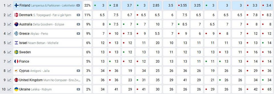 Ξεκάθαρο φαβορί για τη νίκη στη Eurovision 2026 είναι η Φινλανδία, με το «Liekinheitin» των Λίντα Λαμπένιους και Πέτε Πάρκονεν. Αρχικά έδειχνε να βρίσκεται κοντά με τους αντιπάλους του, όμως μέσα σε λίγα 24ωρα διπλασίασε τη διαφορά από τη δεύτερη θέση.