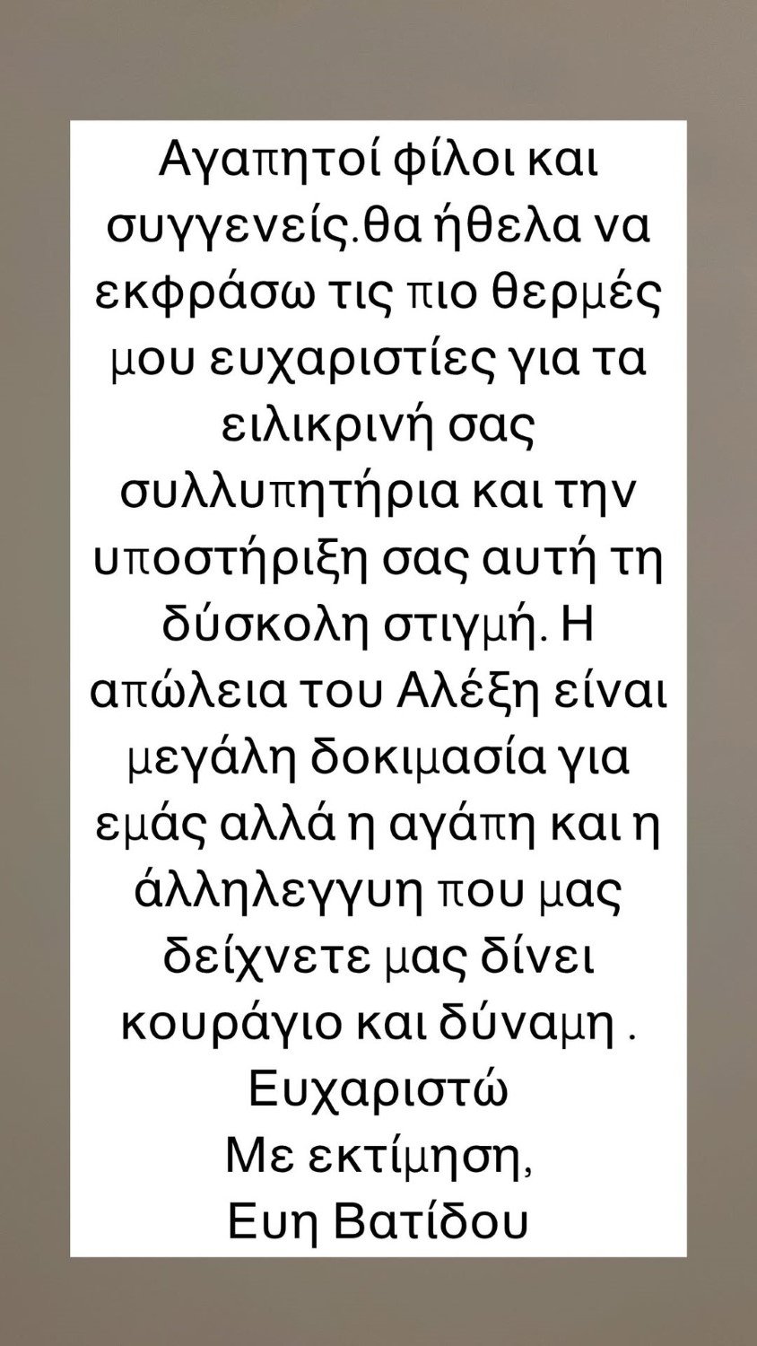 Η απώλεια του Αλέξη είναι μεγάλη δοκιμασία για εμάς, αλλά η αγάπη και η αλληλεγγύη που μας δείχνετε μας δίνει κουράγιο και δύναμη. Ευχαριστώ. Με εκτίμηση, Εύη Βατίδου».