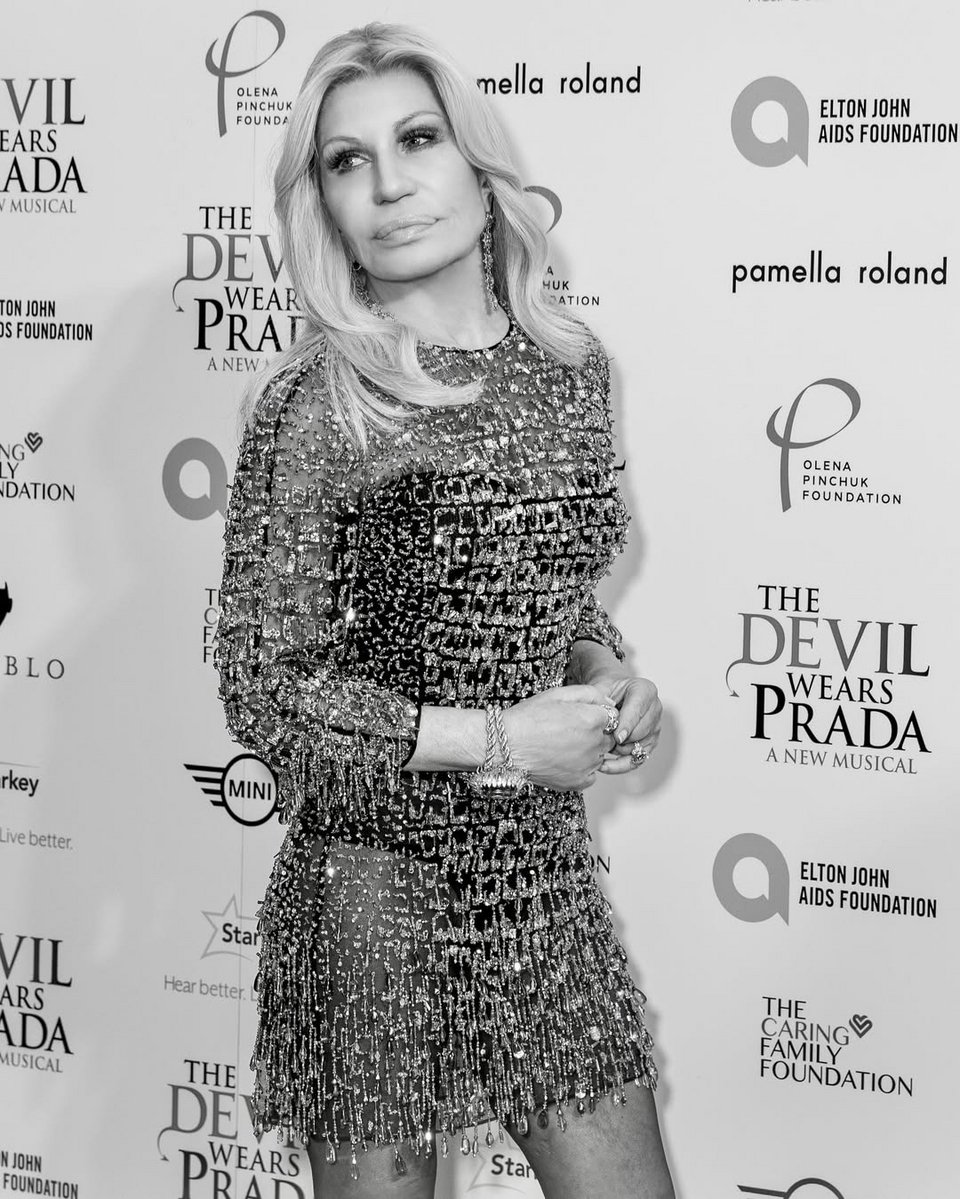 Η 69χρονη Donatella βρέθηκε στο πλευρό του φίλου της σερ Έλτον Τζον, ο οποίος έγραψε τη μουσική για τη θεατρική παράσταση, η οποία επικεντρώνεται στην ομώνυμη κωμωδία του 2006 με πρωταγωνίστριες την Αν Χάθαγουεϊ και τη Μέριλ Στριπ.