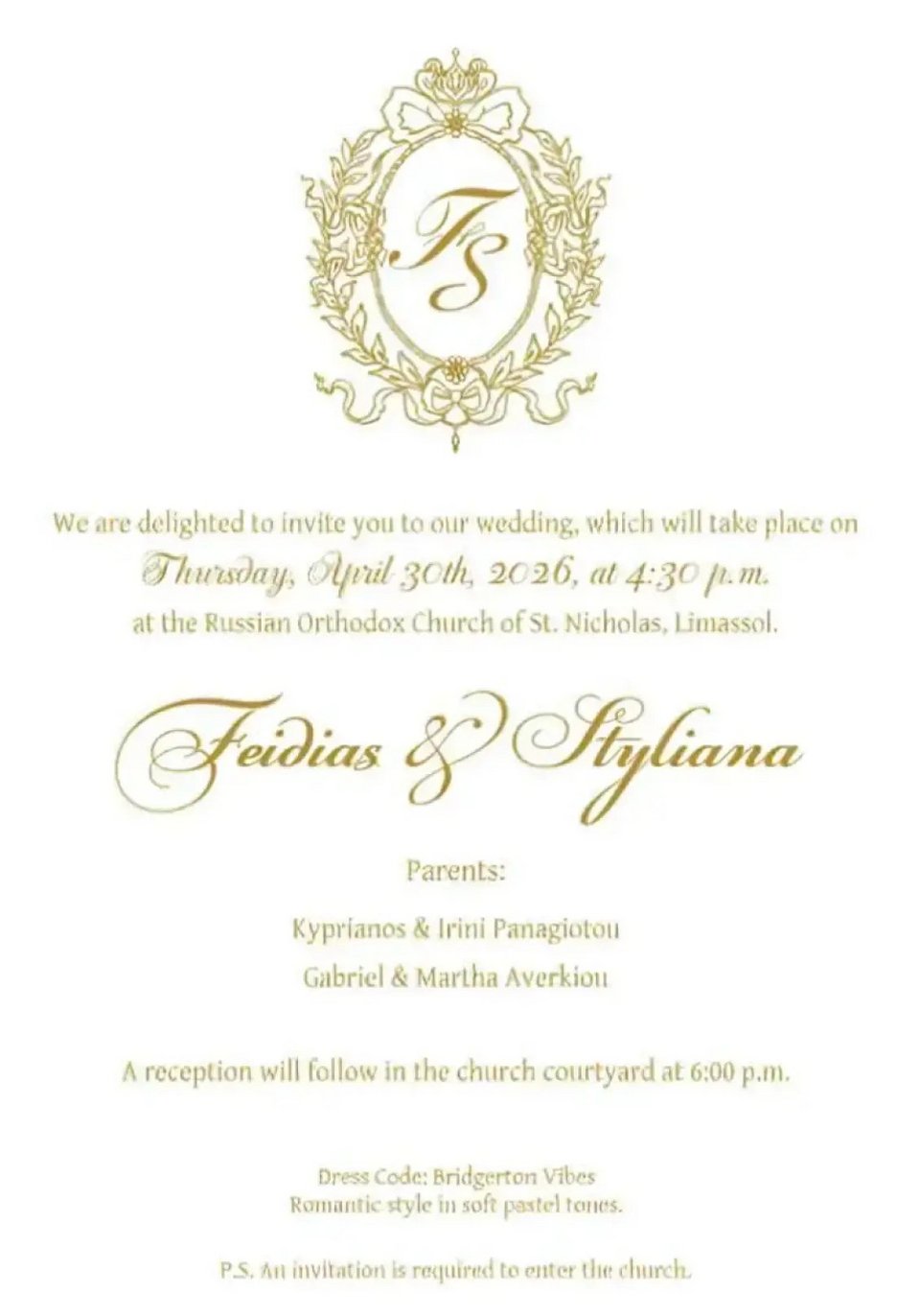 Συγκεκριμένα, ο Κύπριος ευρωβουλευτής και YouTuber Φειδίας Παναγιώτου και η πρώην παίκτρια του «Big Brother» Στυλιάνα Αβερκίου έχουν σχεδιάσει να πραγματοποιήσουν το γάμο τους την Πέμπτη 30 Απριλίου, στις 16:30, στη Ρωσική Ορθόδοξη Εκκλησία του Αγίου Νικολάου, στη Λεμεσό. Όπως φαίνεται και στο προσκλητήριο, θα ακολουθήσει δεξίωση στις 18:00 στον προαύλιο χώρο της εκκλησίας.