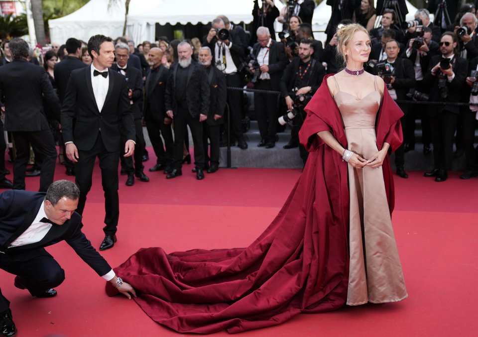 Η Ούμα Θέρμαν, όπως συνηθίζει άλλωστε, έκανε μια κομψή εμφάνιση, φορώντας nude τουαλέτα Dior με κάπα σε βαθύ κόκκινο. Το λουκ της ολοκλήρωσε με ένα τσόκερ Chopard.