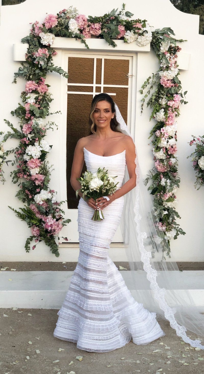 Η νύφη εντυπωσιακή και σέξι έκανε μια κλασική επιλογή νυφικού που αναδείκνυε τις καμπύλες της.