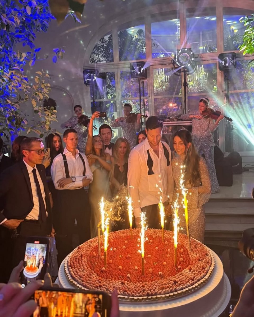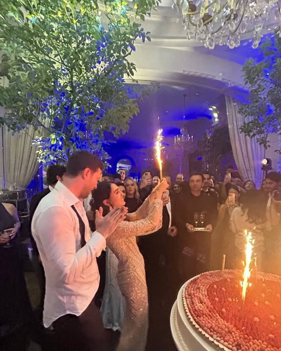 Σε μια άλλη φωτογραφία, το ζευγάρι στέκεται μπροστά από την εντυπωσιακή γαμήλια τούρτα, καλυμμένη με στρώμα από σμέουρα, ενώ οι καλεσμένοι τους φαίνονται να ζητωκραυγάζουν ενθουσιασμένοι.