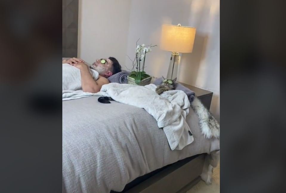 Σε ένα άλλο αστείο βίντεο, ο Καρίμ φαίνεται να απολαμβάνει άλλο μία μέρα σπα αυτή την φορά όχι με την μία γάτα τους, αλλά και με τις 3, οι οποίες δείχνουν ατάραχες όταν τους φωνάζει η ιδιοκτήτριά τους να σηκωθούν.