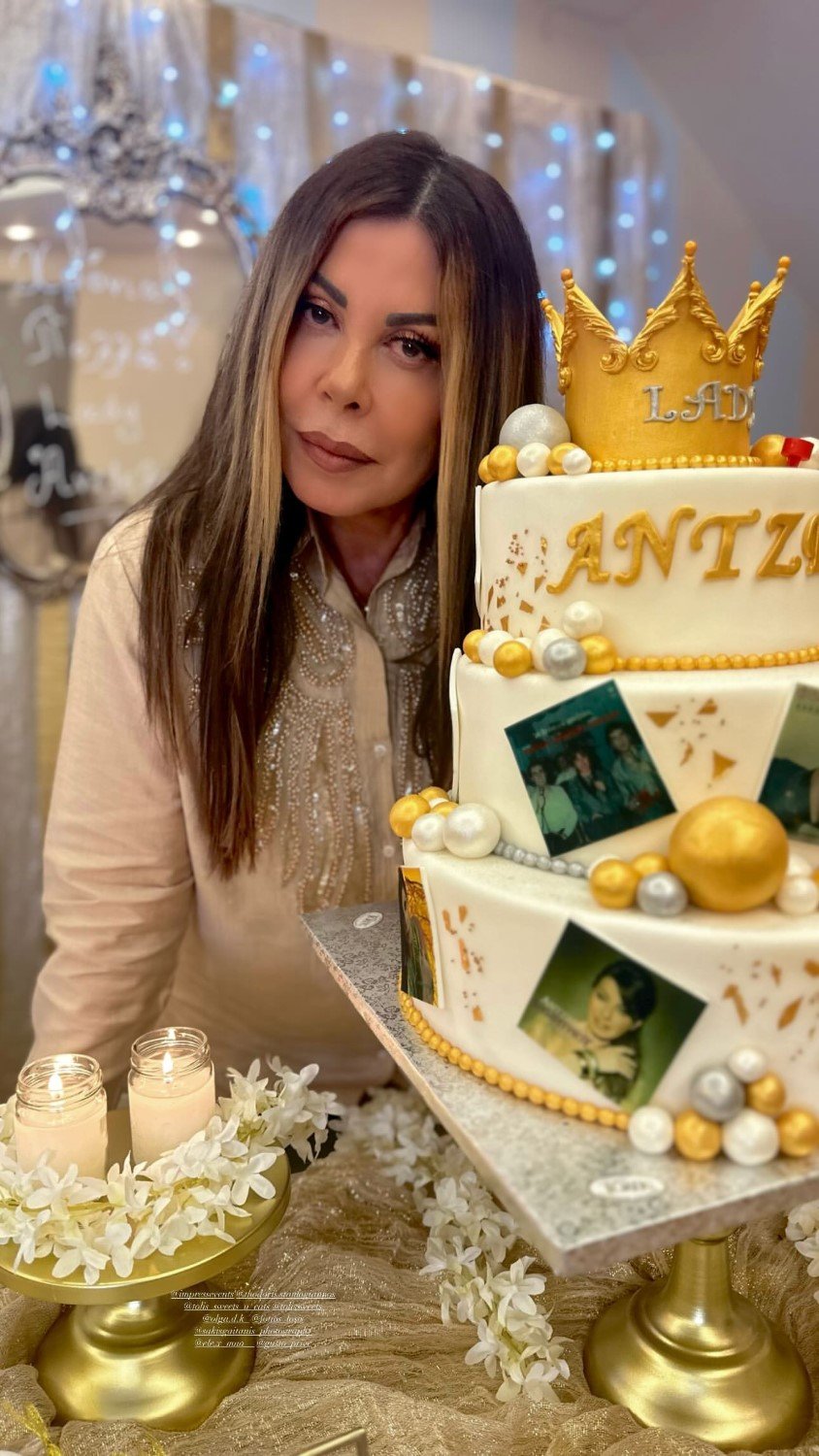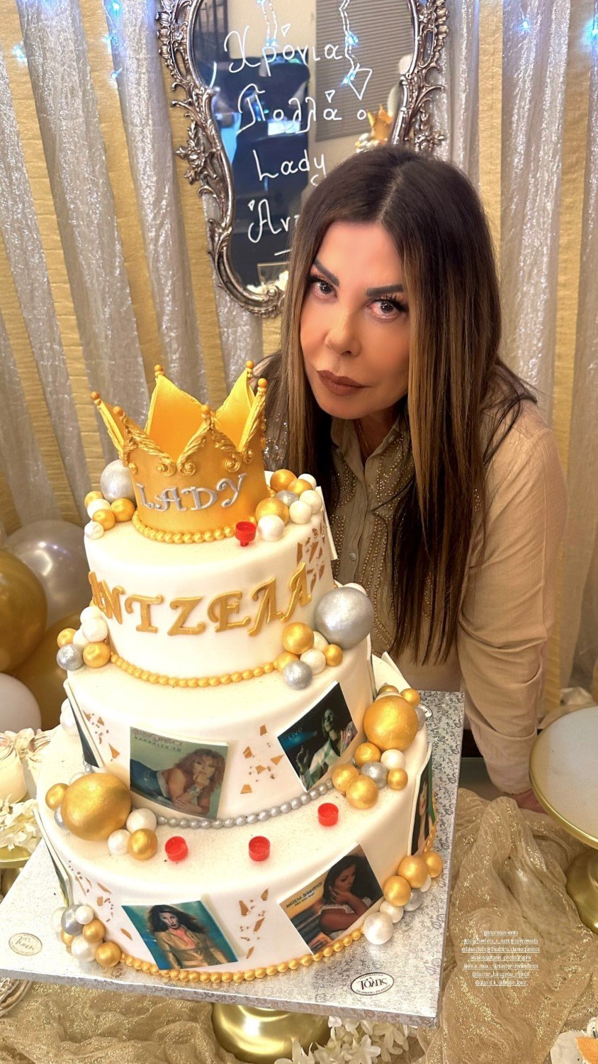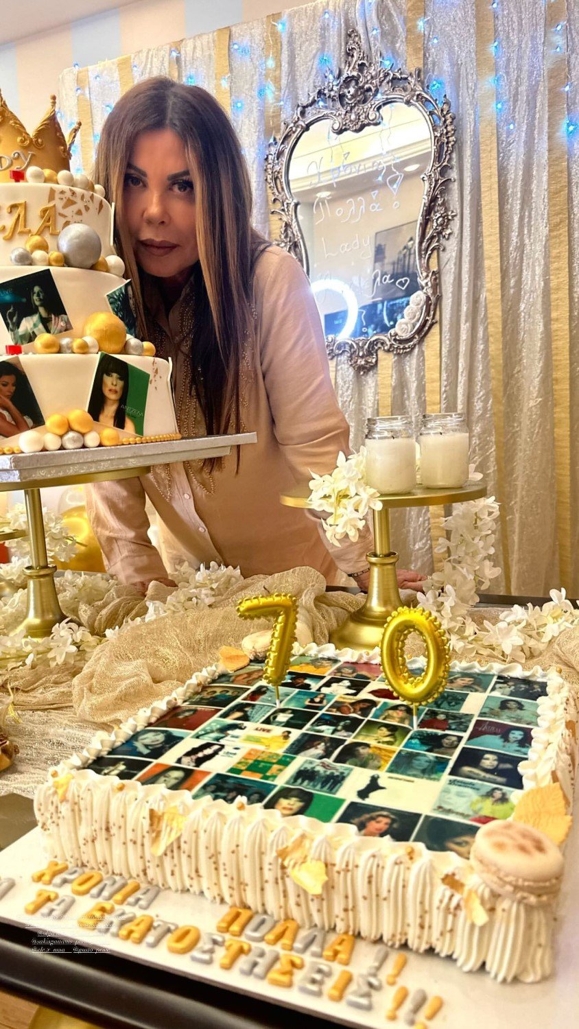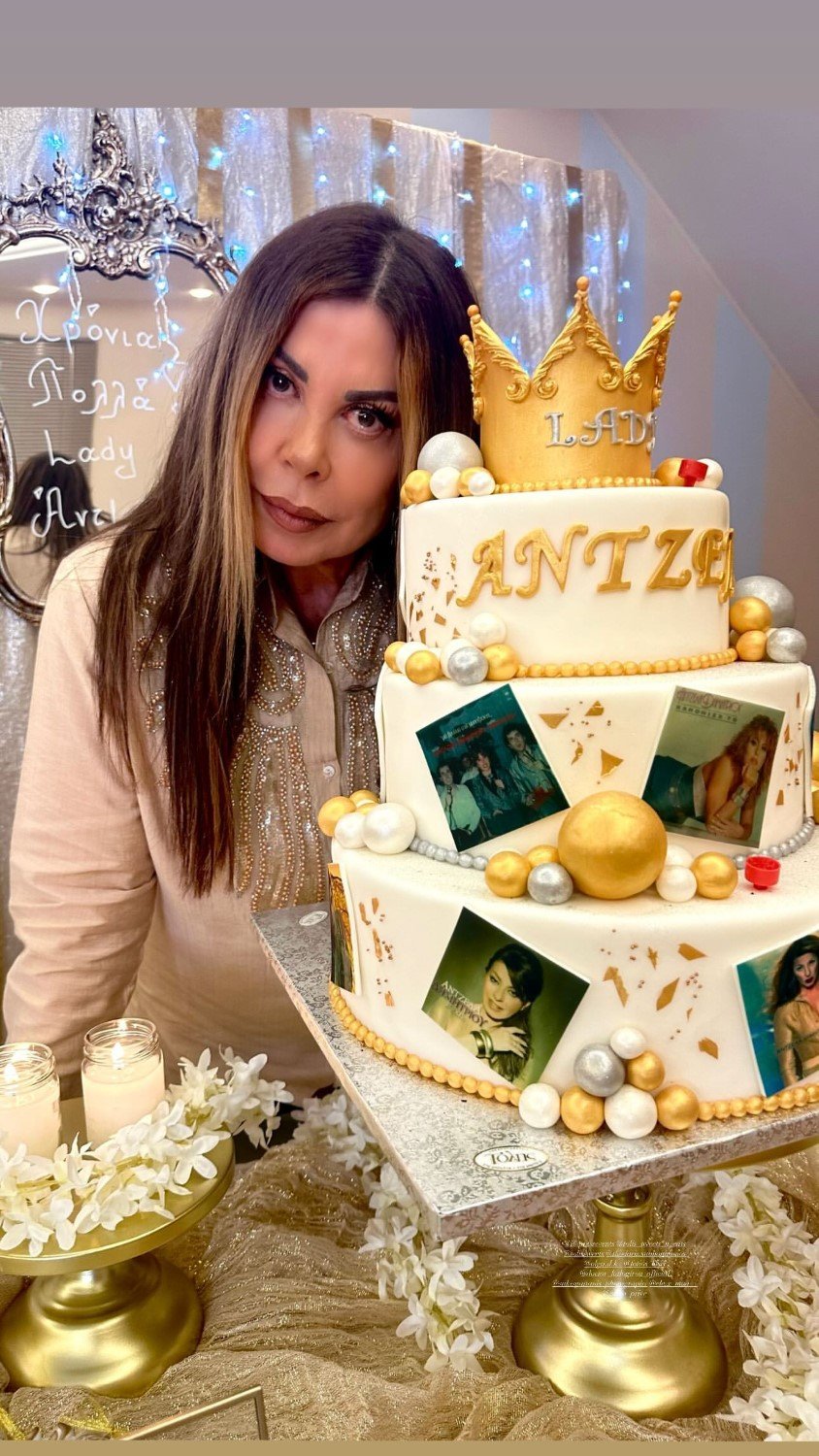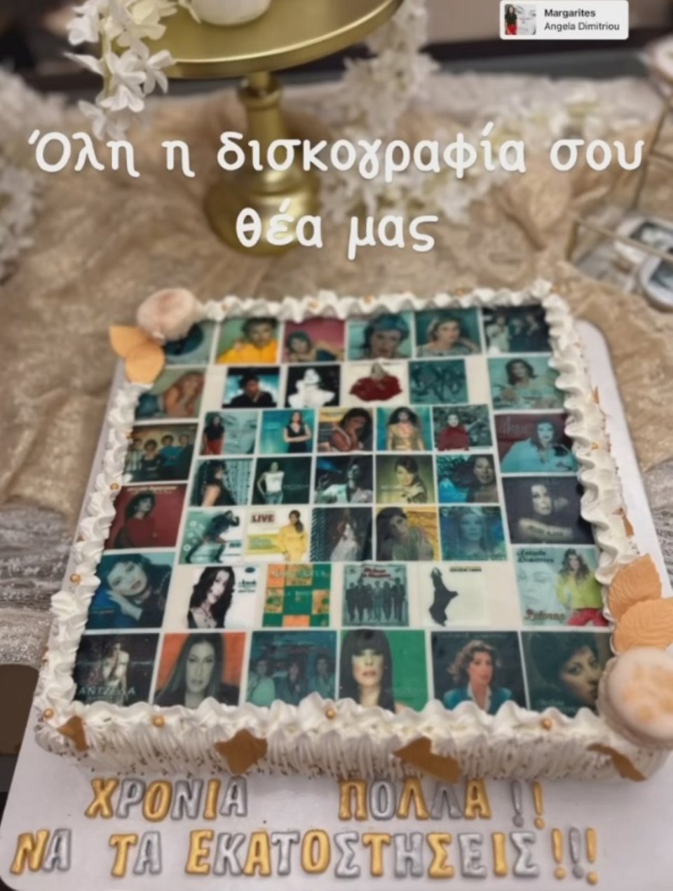 Ωστόσο, αυτή δεν ήταν η μόνη τούρτα στο πάρτι της τραγουδίστριας, αφού λίγο αργότερα καταγράφεται και μία δεύτερη, διακοσμημένη με φωτογραφίες από τα εξώφυλλα των δίσκων της αλλά και με δύο κεράκια πάνω της, τα οποία έσβησε η Άντζελα Δημητρίου, αποκαλύπτοντας πως «έκλεισε» τα 70 της χρόνια.