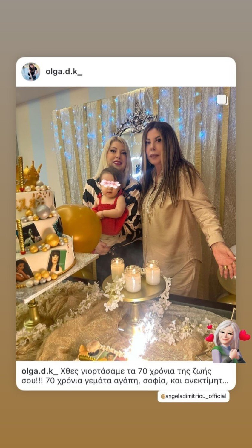 Στα γενέθλια της Άντζελας Δημητρίου, μεταξύ άλλων, έδωσαν το «παρών» η κόρη της, Όλγα Κιουρτσάκη, με τον σύζυγό της, Φώτη Λιώση, και την κόρη τους και εγγονή της τραγουδίστριας.