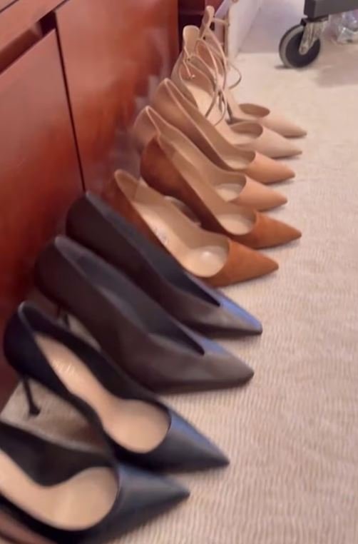 Έπειτα, παρουσιάζει την γκαρνταρόμπα του ταξιδιού της: ακριβά τοπ και δερμάτινες τσάντες καθώς και αμέτρητα παντελόνια που κρέμονται, σχολαστικά τοποθετημένα σε κρεμάστρες.
