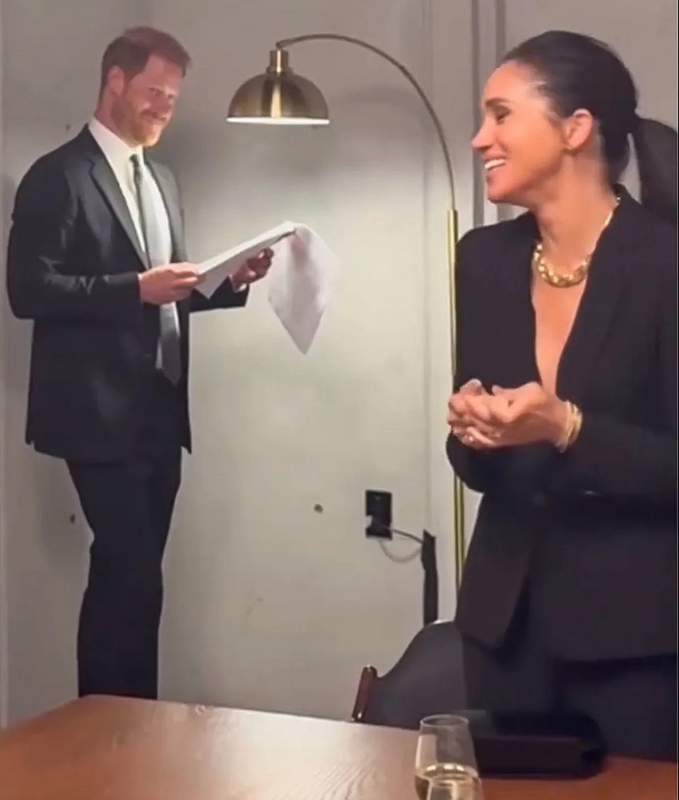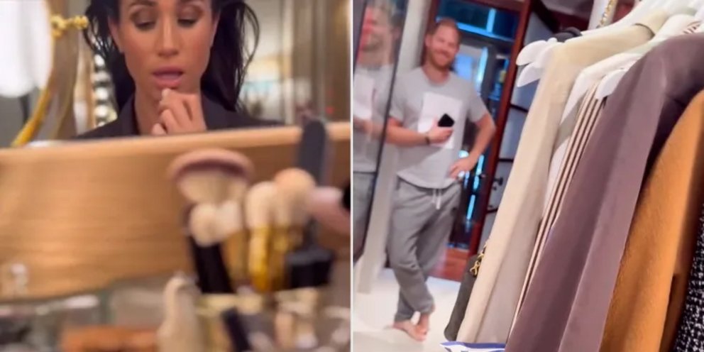 Καθώς η κάμερα περνά ανάμεσα στα ρούχα, η Μέγκαν στρέφει τον φακό προς τον πρίγκιπα Χάρι, που χαμογελά καθώς στέκεται ξυπόλυτος στην πόρτα, φορώντας γκρι φόρμα και ταιριαστό μπλουζάκι.