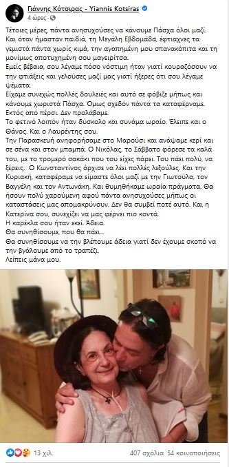 Συγκινητικό είναι το μήνυμα του Γιάννη Κότσιρα στο Facebook για τη μητέρα του που έχει φύγει από τη ζωή.