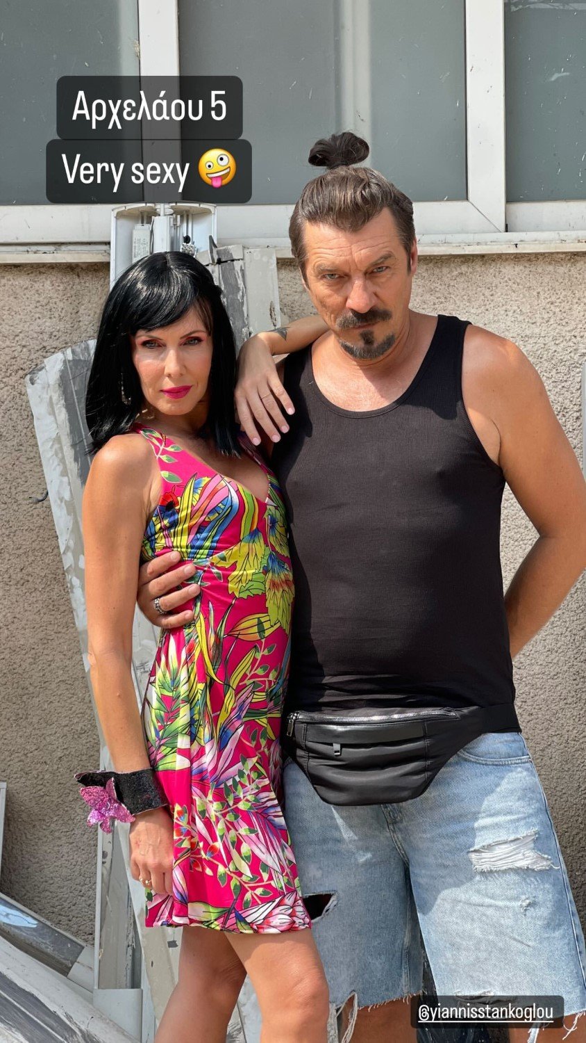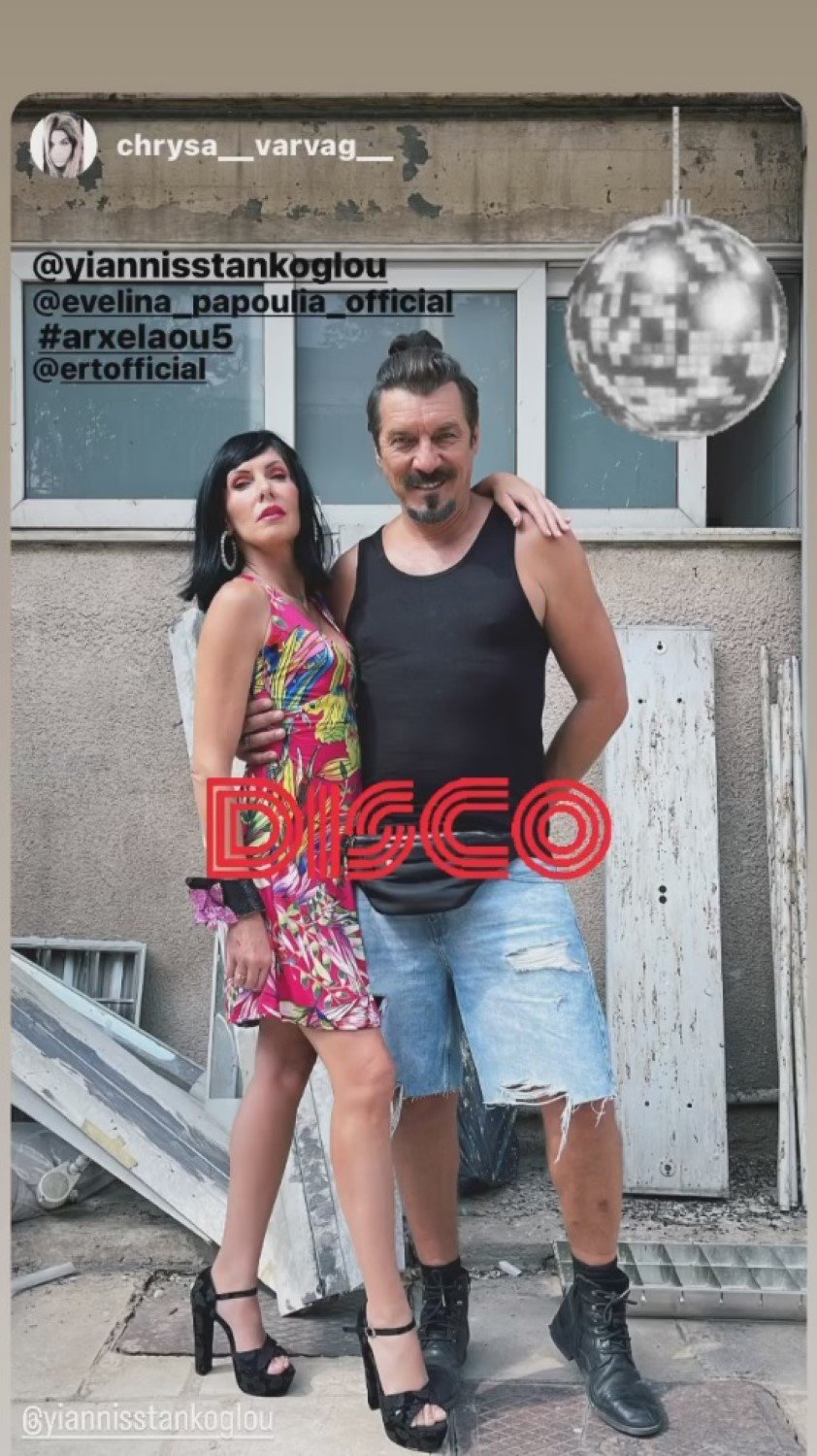 Την ίδια ώρα, η Εβελίνα Παπούλια εμφανίζεται με μαύρα μαλλιά, έντονο μακιγιάζ, και ένα πολύχρωμο μίνι φόρεμα, με την εικόνα και των δύο να παραπέμπει στην εποχή της disco, όπως, άλλωστε, σημειώνεται και στη λεζάντα του σχετικού story.
