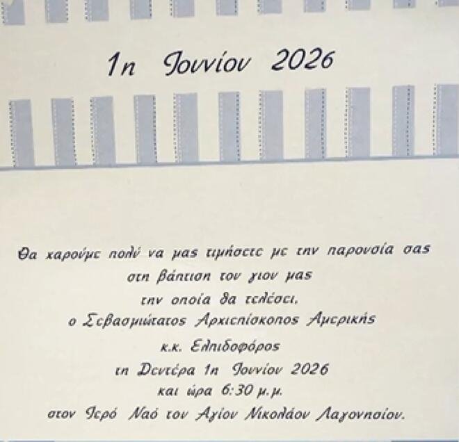 Συγκεκριμένα, στο προσκλητήριο αναγράφεται: «Θα χαρούμε πολύ να μας τιμήσετε με την παρουσία σας στη βάφτιση του γιου μας, την οποία θα τελέσει ο Σεβασμιότατος Αρχιεπίσκοπος Αμερικής κ.κ. Ελπιδοφόρος τη Δευτέρα 1η Ιουνίου 2026 και ώρα 6:30 μ.μ. στον Ιερό Ναό του Αγίου Νικολάου Λαγονησίου».