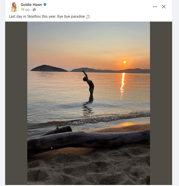 Φέτος απ' ό,τι φαίνεται, η Γκόλντι Χον τελείωσε νωρίς τις διακοπές της στη Σκιάθο, μιας και ανέβασε μια φωτογραφία με την ίδια να έχει βουτήξει στα καθαρά νερά του νησιού, την ώρα που ο ήλιος δύει, δημιουργώντας ένα μαγευτικό σκηνικό.