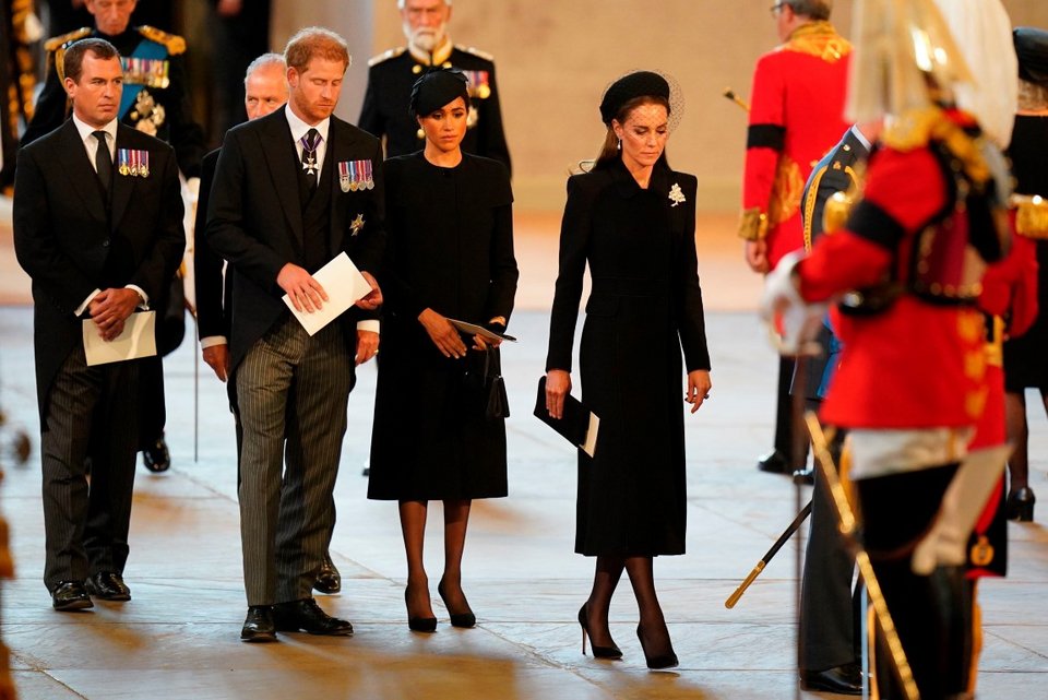 Κέιτ, Μέγκαν, Γουίλιαμ, Χάρι, οι άλλοτε FAB 4, κάθισαν μαζί στο σημείο που είχε καθοριστεί για εκείνους στην αίθουσα του Ουέστιμινστερ. Ντυμένες στα μαύρα, με καπέλα και βέλη, οι δύο δούκισσες έμοιαζαν βαθιά συγκινημένες στην τελετή αυτή αποχαιρετισμού στη βασίλισσα Ελισάβετ.