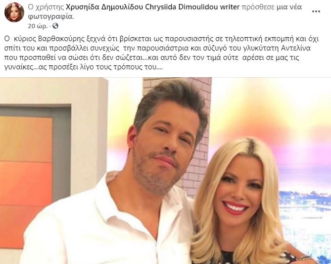 Πιο συγκεκριμένα η Χρυσηίδα Δημουλίδου έγραψε: «Ο κύριος Βαρθακούρης ξεχνά ότι βρίσκεται ως παρουσιαστής σε τηλεοπτική εκπομπή και όχι σπίτι του και προσβάλλει συνεχώς την παρουσιάστρια και σύζυγό του γλυκύτατη Αντελίνα που προσπαθεί να σώσει ότι δεν σώζεται…και αυτό δεν τον τιμά ούτε αρέσει σε μας τις γυναίκες…ας προσέξει λίγο τους τρόπους του…», έγραψε η γνωστή συγγραφέας.