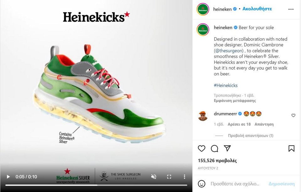Ο Dominic με έδρα το Λος Άντζελες, ο οποίος έχει δημιουργήσει παρόμοια παπούτσια για τον Τζάστιν Μπίμπερ και κορυφαίους αστέρες του μπάσκετ, πρόσθεσε: «Η Heineken και εγώ μοιραζόμαστε ένα πάθος για την καινοτομία και την υπέρβαση των ορίων και δημιούργησα ένα σχέδιο που να το αντανακλά αυτό. Δεν μπορώ να πω ότι έχω ξανασχεδιάσει αθλητικά παπούτσια που περιέχουν μπύρα».