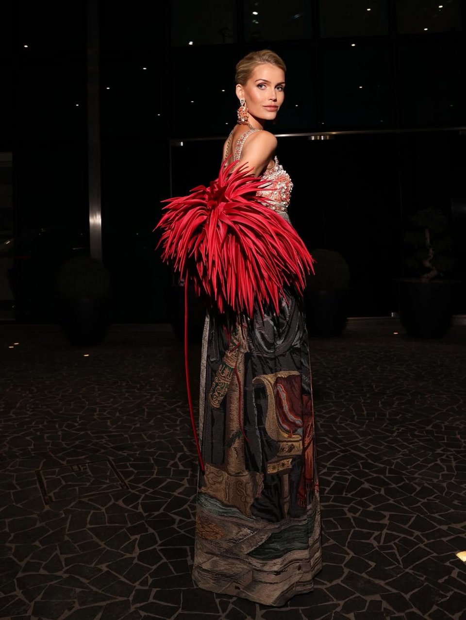 Αν και το φόρεμα ήταν αμάνικο, η Κίτι πρόσθεσε μια έντονη πινελιά χρώματος με κόκκινα αξεσουάρ που θύμιζαν φτερά, στερεωμένα στους καρπούς της σαν αυτοσχέδια μανίκια.