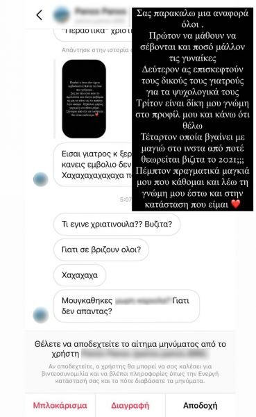 «Σας παρακαλώ μια αναφορά όλοι. Πρώτον, να μάθουν να σέβονται και πόσο μάλλον τις γυναίκες, δεύτερον, ας επισκεφτούν τους δικούς τους γιατρούς για τα ψυχολογικά τους, τρίτον είναι δική μου γνώμη, στο προφίλ μου και κάνω ό,τι θέλω, τέταρτον, όποια βγαίνει με μαγιό στο Instagram, από πότε θεωρείται βίζιτα το 2021; Πέμπτον, πραγματικά μαγκιά μου, που κάθομαι λέω τη γνώμη μου, έστω και στην κατάσταση που είμαι.