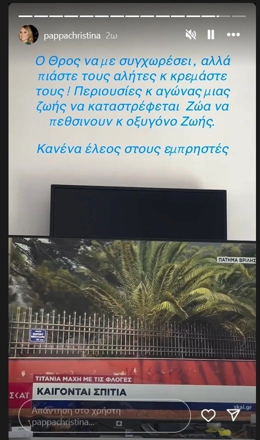 Την αγανάκτησή της για τις φωτιές που εκδηλώνονται σε όλη τη χώρα εξέφρασε η Χριστίνα Παππά, με αφορμή και το πύρινο μέτωπο στη βορειοανατολική Αττική.