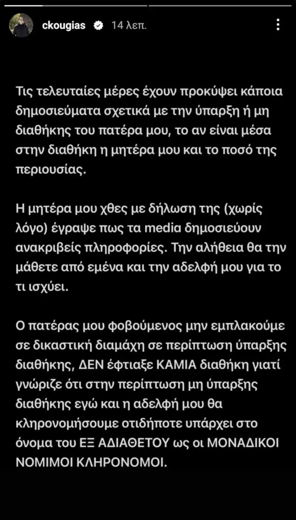 «Τις τελευταίες μέρες έχουν προκύψει κάποια δημοσιεύματα σχετικά με την ύπαρξη ή μη διαθήκης του πατέρα μου, το αν είναι μέσα στη διαθήκη η μητέρα μου και το ποσό της περιουσίας. Η μητέρα μου χθες με δήλωσή της (χωρίς λόγο) έγραψε πως τα media δημοσιεύουν ανακριβείς πληροφορίες. Την αλήθεια θα την μάθετε από εμένα και την αδελφή μου για το τι ισχύει.