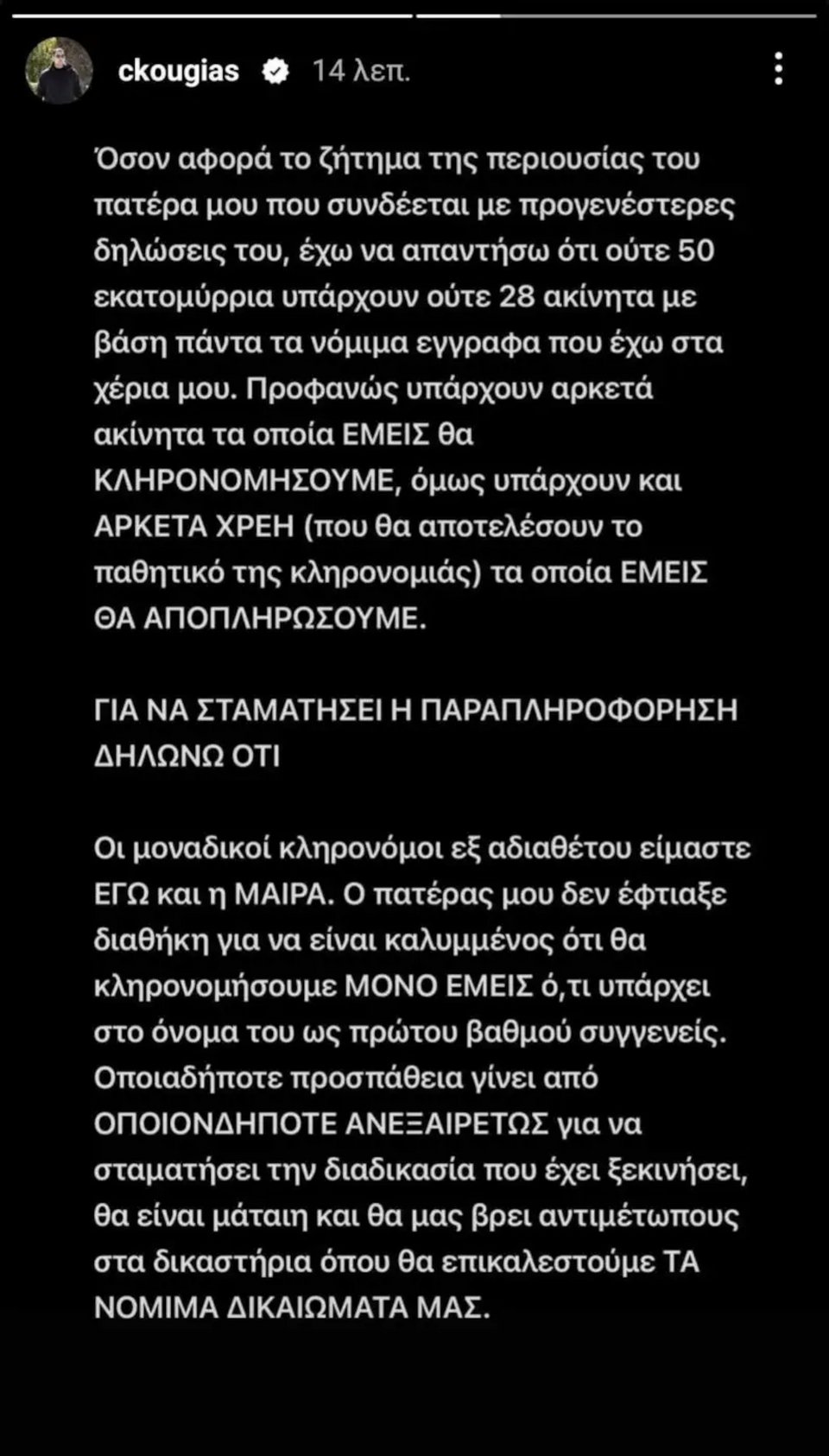 Ο Χρίστος Κούγιας διευκρινίζει ότι ο πατέρας του, που πέθανε μετά από μεγάλη μάχη με τον καρκίνο, δεν συνέταξε διαθήκη καθώς γνώριζε ότι εκείνος και η αδελφή του είναι μοναδικοί νόμιμοι κληρονόμοι.