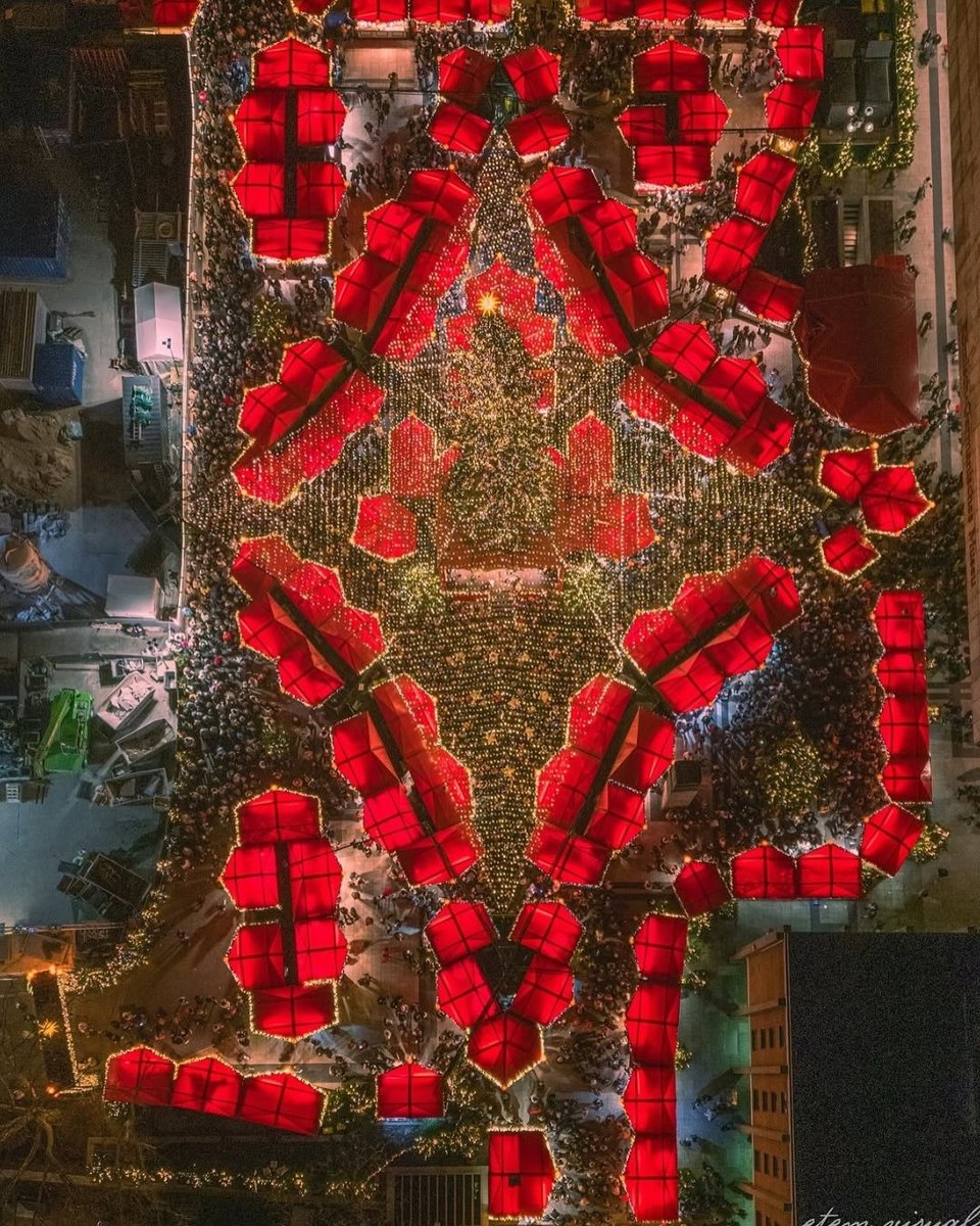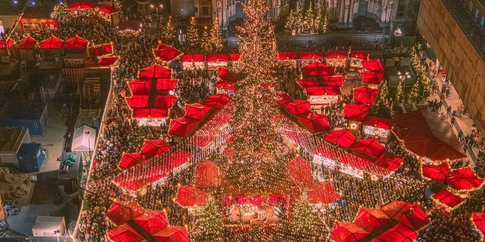 Το σκηνικό είναι μαγευτικό: πάνω από 150 ξύλινοι πάγκοι με τις κόκκινες τέντες τους εκτείνονται στην πλατεία Ρονκαλπλάτς, με το εκθαμβωτικό χριστουγεννιάτικο δέντρο να σχηματίζει έναν λαμπερό θόλο από φώτα πάνω από την αγορά.