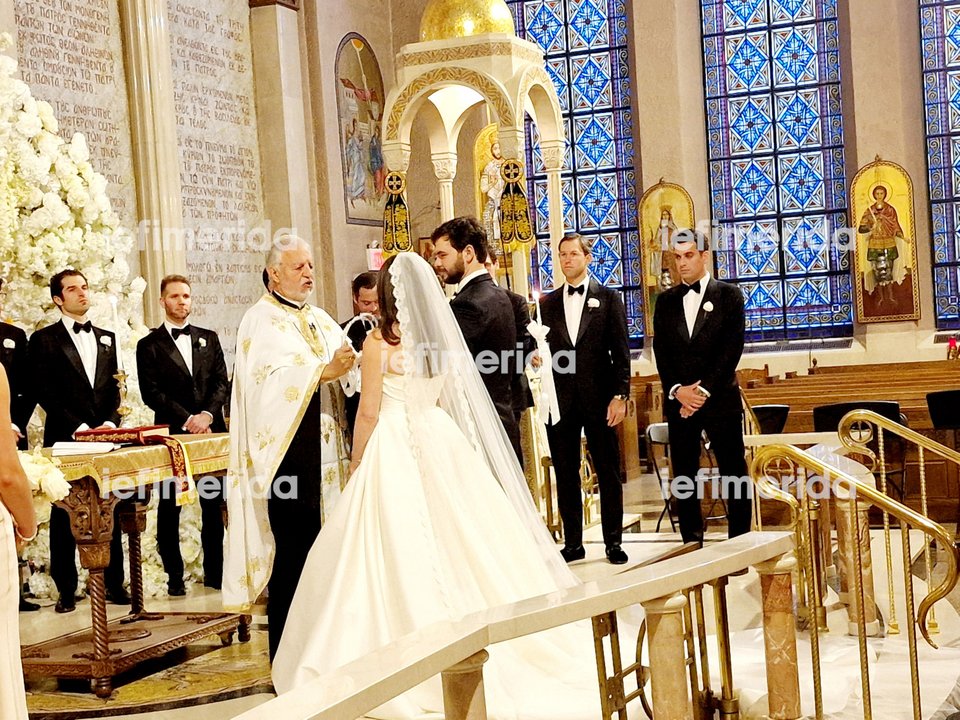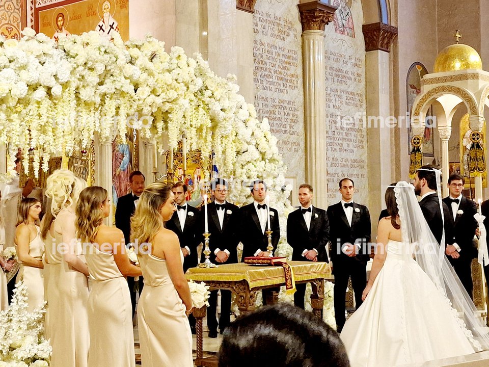 Οι εντυπωσιακές παράνυμφες, ανάμεσά τους και η αδελφή του γαμπρού, Άντρια, αλλά και οι παράγαμπροι πλαισίωσαν το ζευγάρι μπροστά από το ιερό, πριν ξεκινήσει η τελετή στα ελληνικά και στα αγγλικά από τον πατέρα Άλεξ Καρλούτσο, νονό του γαμπρού και στενό φίλο της οικογένειας.