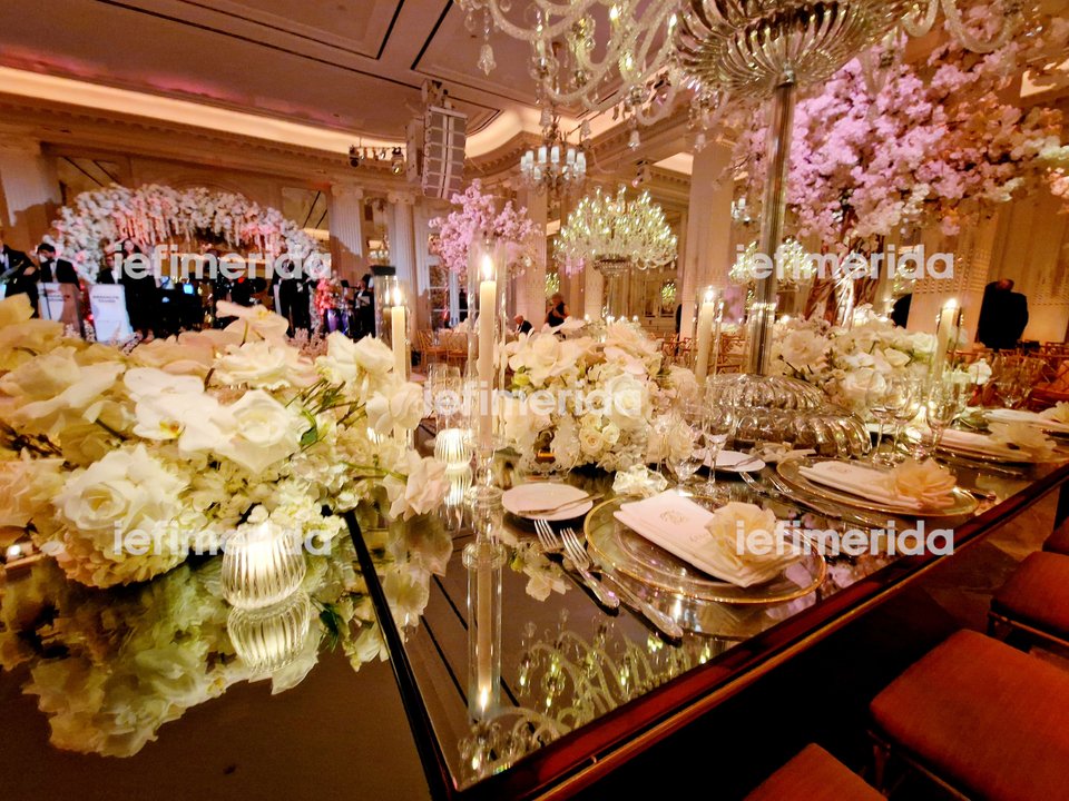 Μετά την τελετή, οι καλεσμένοι μετακινήθηκαν στο αριστοκρατικό ξενοδοχείο Pierre στην 5η λεωφόρο του Μανχάταν, δίπλα στο Central Park. Οι κυρίες με τις τουαλέτες και οι κύριοι με τα σμόκιν -καθώς το dress code ήταν black tie- πέρασαν πρώτα στη σάλα υποδοχής για ένα κοκτέιλ και στη συνέχεια στην αίθουσα της δεξίωσης, που είχε στολιστεί με χιλιάδες λευκά λουλούδια. Από τα τραπέζια έβγαιναν ολόκληρα ανθισμένα δέντρα, ενώ κρύσταλλα και κηροπήγια συμπλήρωναν το πολυτελές σκηνικό.