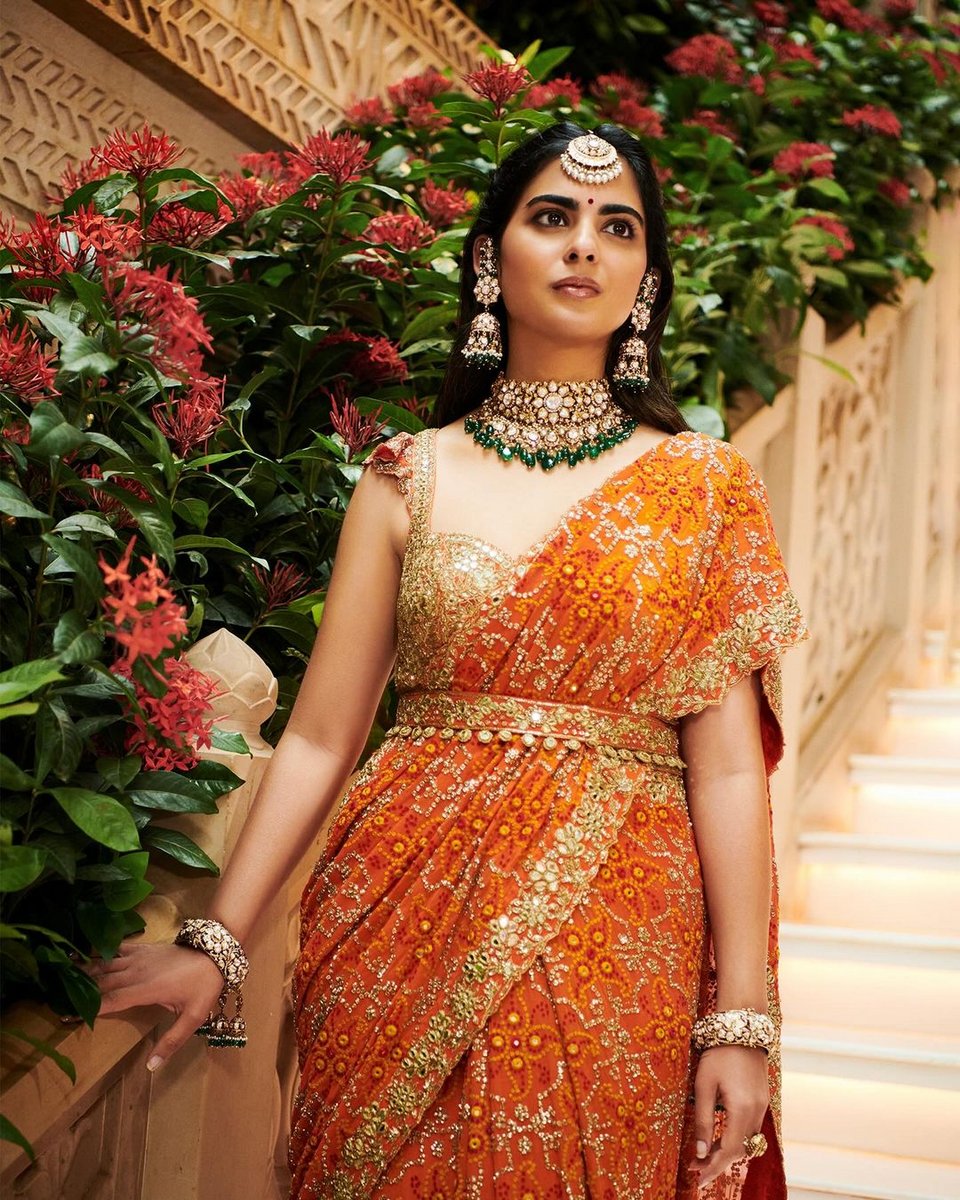 Οι υπέροχες επιλογές της Isha, που έγιναν από τη βοήθεια της στιλίστριας Anaita Shroff Adajania, καθ' όλη τη διάρκεια των προγαμιαίων εορτασμών ανέδειξαν την πολυπλοκότητά της και την ικανότητά της να συνδυάζει απρόσκοπτα την παράδοση με τη σύγχρονη κομψότητα.