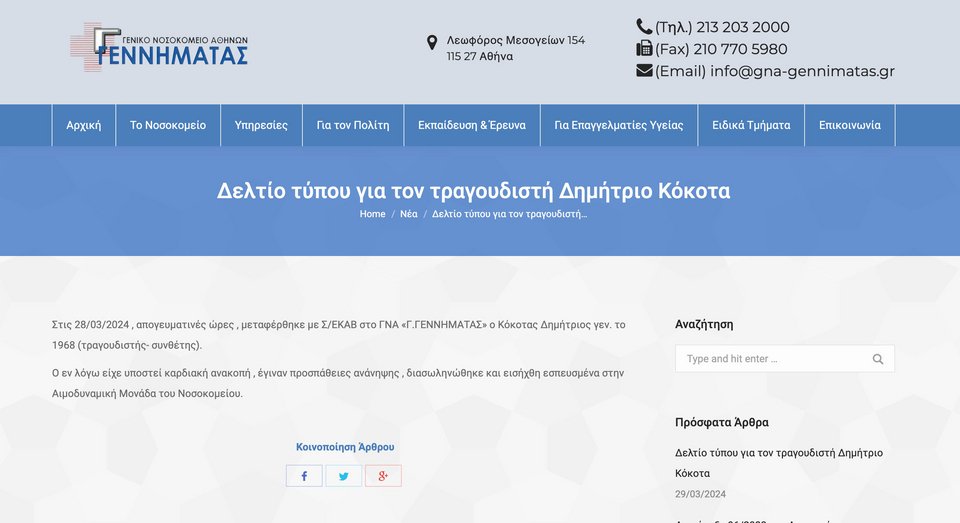 «Στις 28/3/2024, απογευματινές ώρες, μεταφέρθηκε με Σ/ΕΚΑΒ στο ΓΝΑ "Γ. ΓΕΝΝΗΜΑΤΑΣ" ο Κόκοτας Δημήτριος, γενν. το 1968 (τραγουδιστής-συνθέτης). Ο εν λόγω είχε υποστεί καρδιακή ανακοπή, έγιναν προσπάθειες ανάνηψης, διασωληνώθηκε και εισήχθη εσπευσμένα στην Αιμοδυναμική Μονάδα του Νοσοκομείου», αναφέρει η ανακοίνωση του νοσοκομείου.