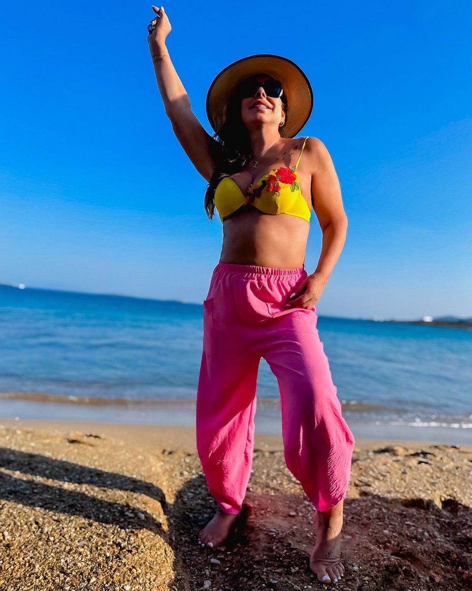 Η Αντζελα Δημητρίου φόρεσε ένα κίτρινο μπικίνι και μία φούξια παντελόνα και πόζαρε στην ακρογιαλιά γράφοντας: «Αυτόν τον ήλιο κι αυτά τα καταγάλανα νερά δεν τα βρίσκεις πουθενά αλλού!!! Αυτή είναι η υπέροχη Ελλάδα μας!!! Σας αγαπώ πολύ!»/