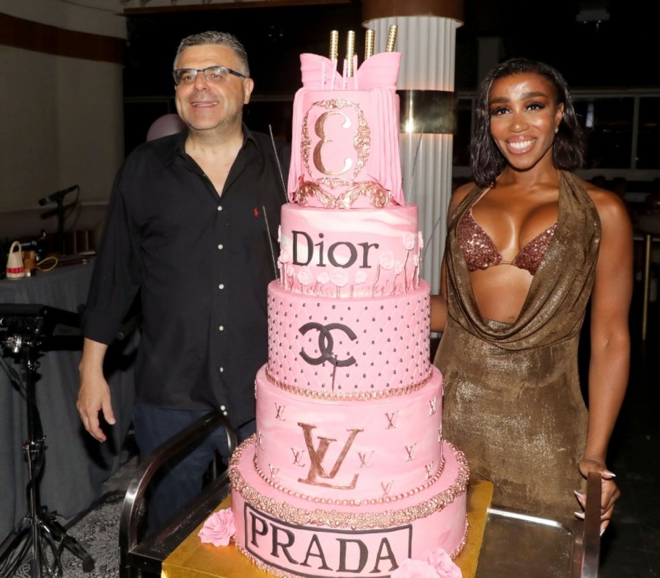 Το πάρτι όμως «έκλεψε» η «πολυώροφη» ροζ τούρτα, που είχε γραμμένες πάνω τις μάρκες οίκων μόδας, Dior και Prada.