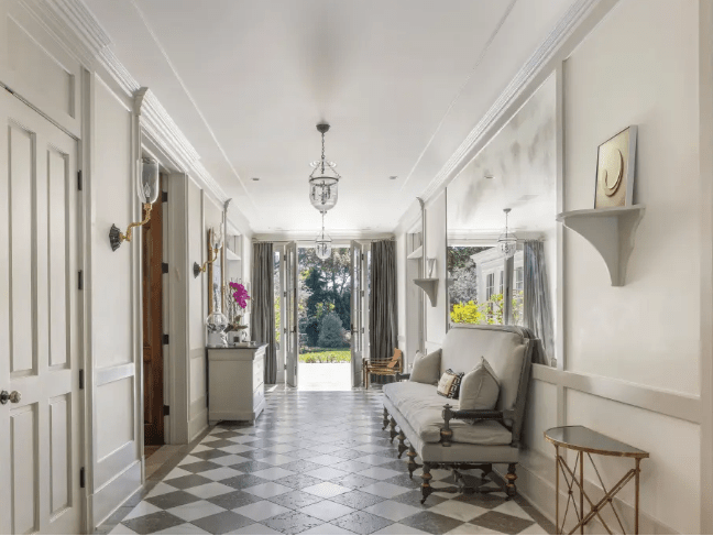 Ο μπροστινός διάδρομος διαθέτει ασπρόμαυρο πλακάκι στο δάπεδο και γαλλικές πόρτες. Οδηγεί στο σαλόνι, το οποίο είναι ιδανικό για φιλοξενία, με τζάκι καύσης ξύλου, μπαρ, άπλετο χώρο καθιστικού και τοίχους με λευκές επενδύσεις.