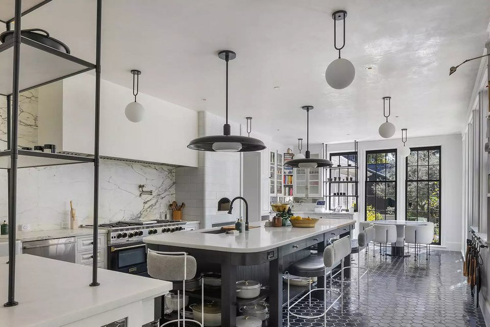 Η κουζίνα είναι το όνειρο κάθε σεφ, με ψηλά ταβάνια, παράθυρα από το δάπεδο μέχρι την οροφή, μαύρα πλακάκια στο δάπεδο και έναν τεράστιο πάγκο εργασίας.