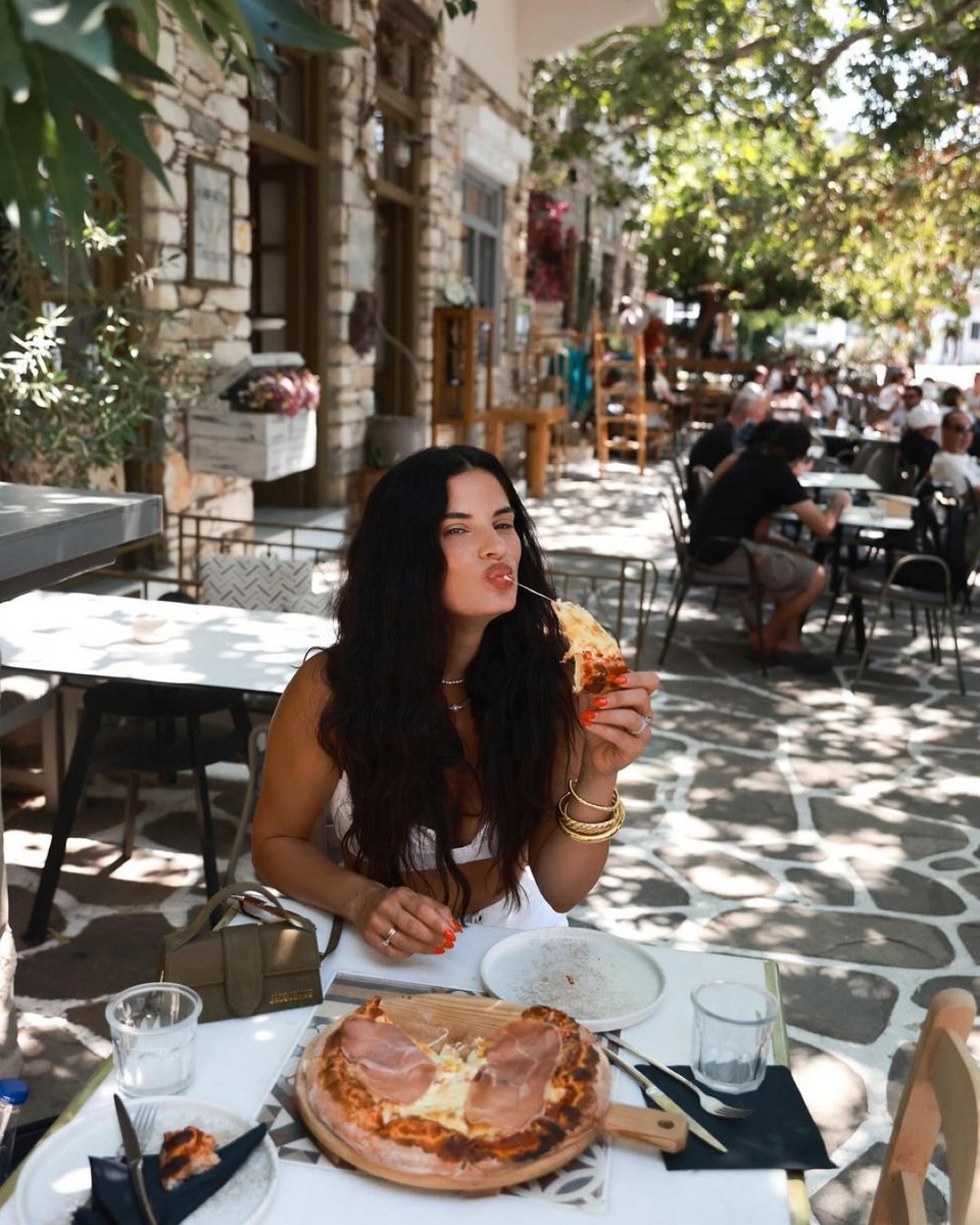 Η ίδια καταγράφεται και να απολαμβάνει μία πίτσα σε ένα γραφικό χωριουδάκι, φορώντας ένα λευκό παντελόνι και ένα λευκό τοπ.