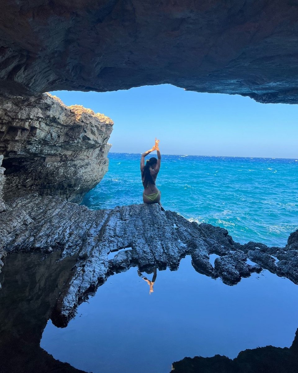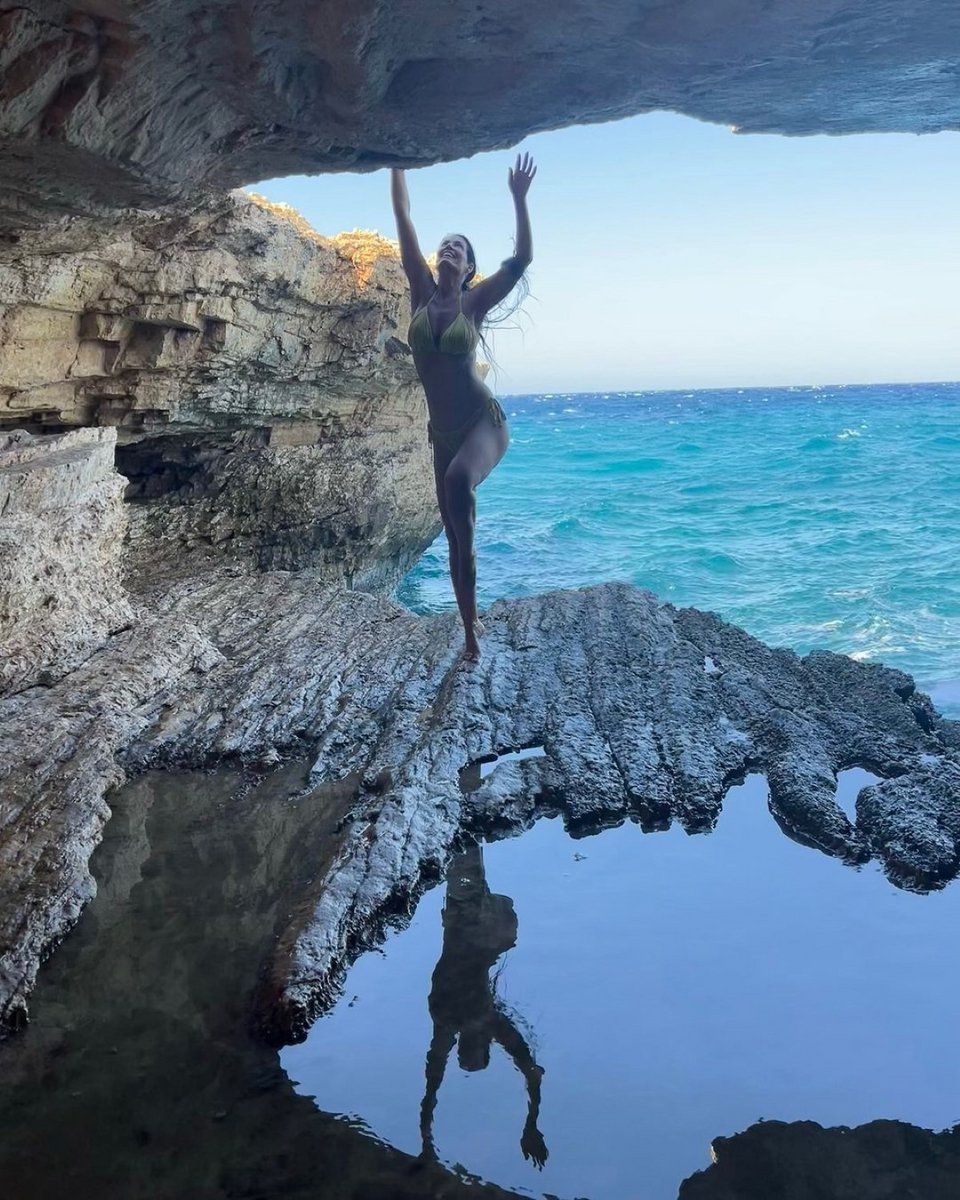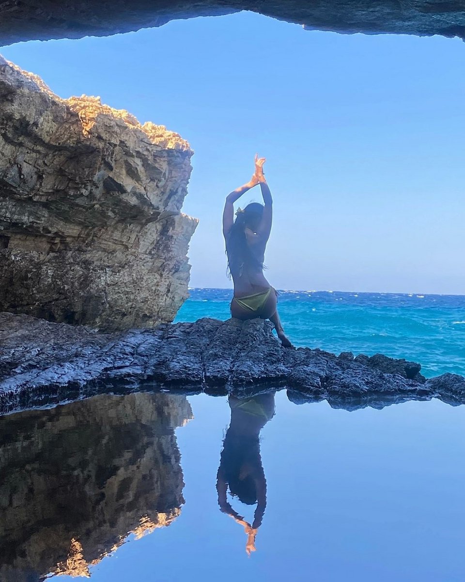 Σε ανάρτηση που έκανε η ηθοποιός το βράδυ της Τετάρτης, 31/07, η ίδια καταγράφεται κατά την επίσκεψή της στο επονομαζόμενο «Μάτι του διαβόλου», μια μικρή σπηλιά που επικοινωνεί με τη θάλασσα και αποτελεί ένα από τα πιο γνωστά αξιοθέατα του νησιού.